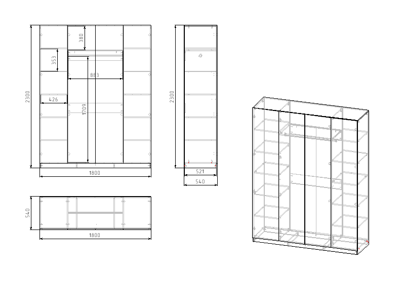 Габариты шкафа: ширина 1800, высота 2300, глубина 540 мм