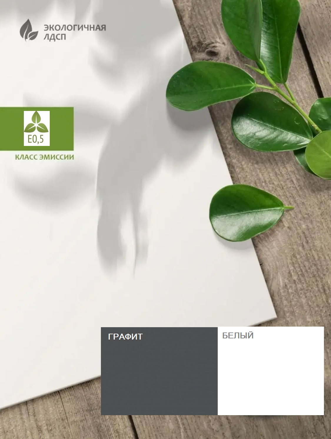 ЛДСП Е0,5. Толщина 16 мм. Доступна в цветах: корпус белый + фасады графит, корпус белый + фасады дуб золотистый, корпус дуб золотистый + фасады графит, полностью белый или полностью велюр, корпус графит + фасады белые