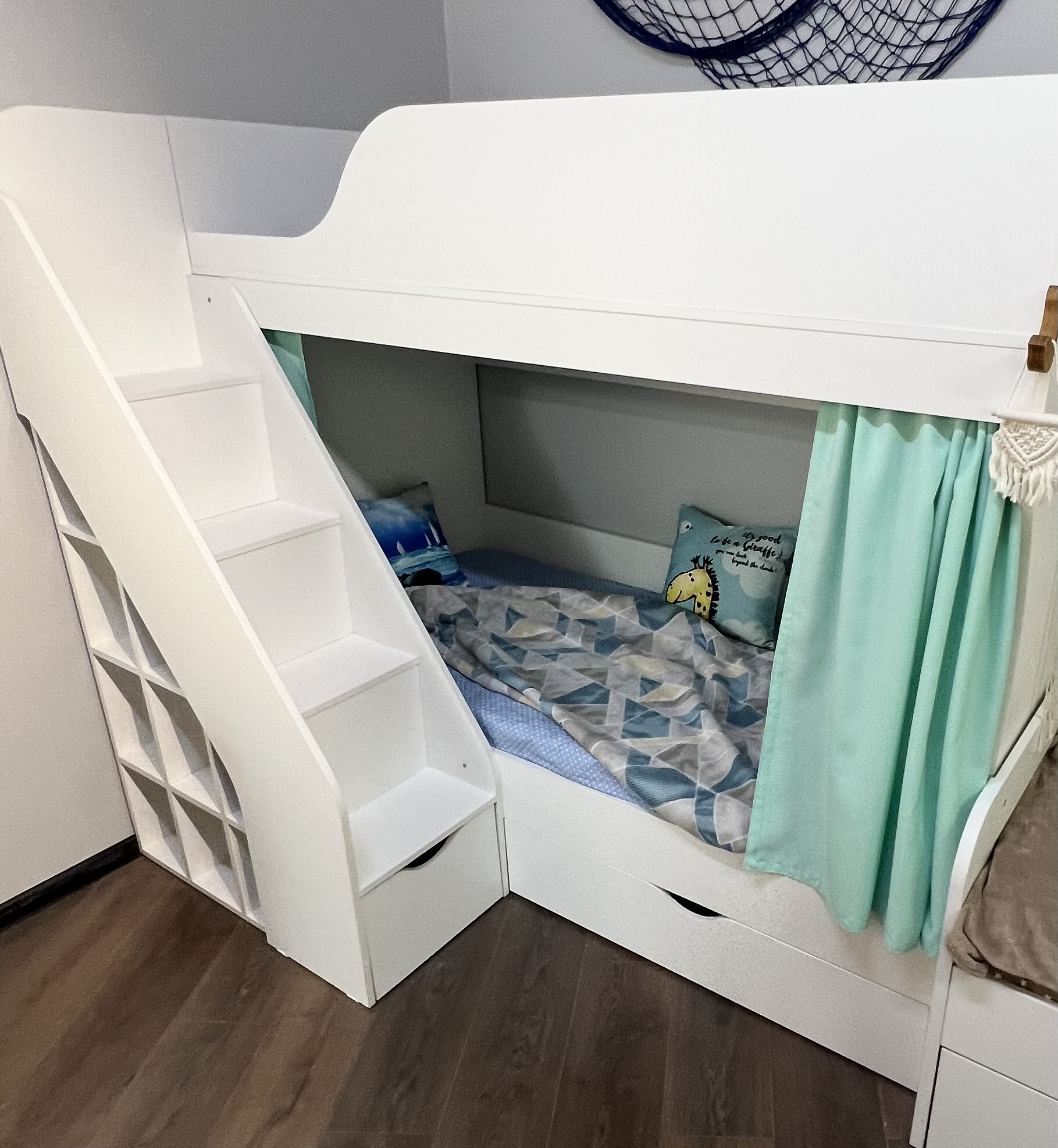 Удобная, безопасная лестница со встроенными полочками для книг и игрушек и комфортная высота кровати.