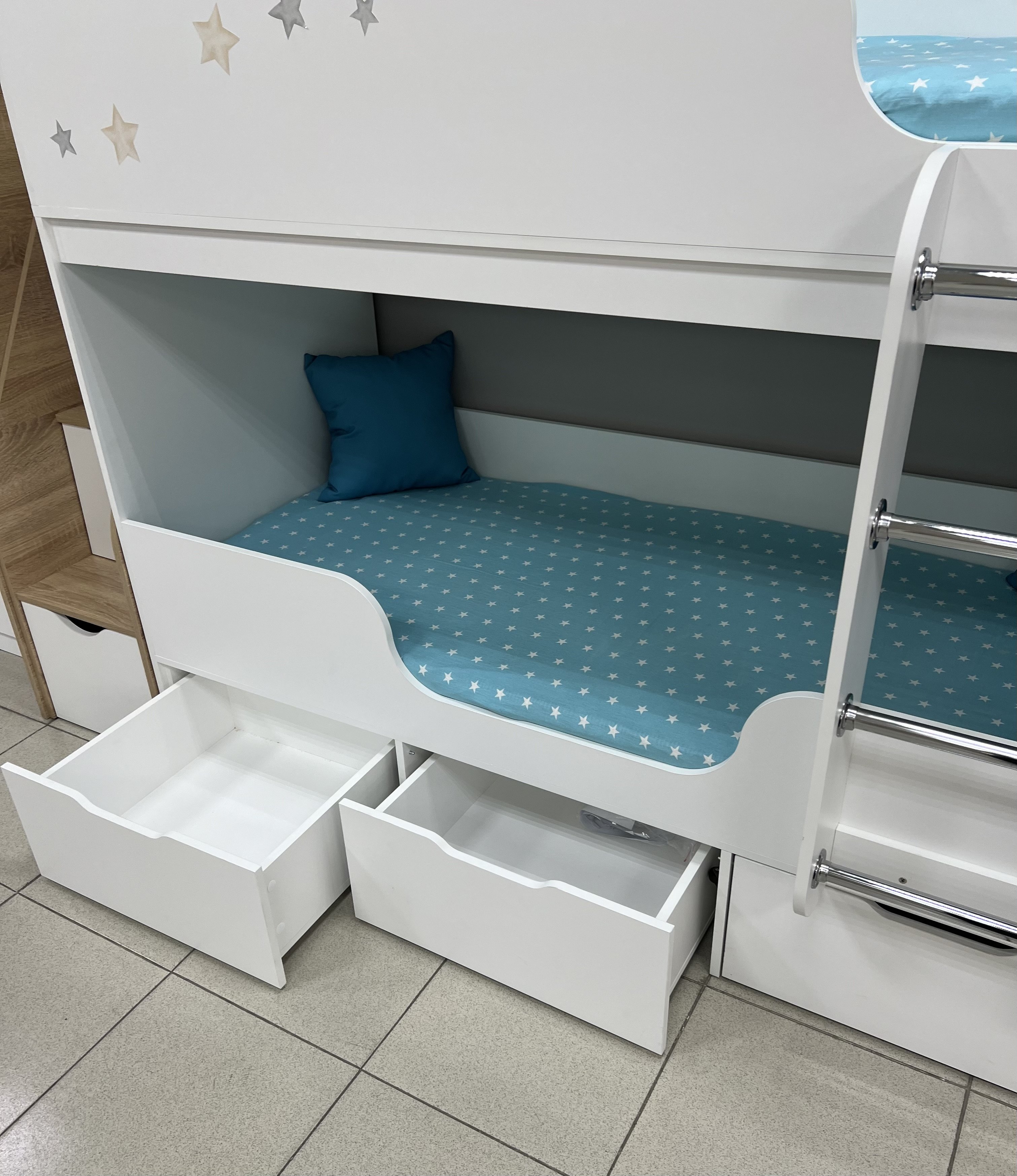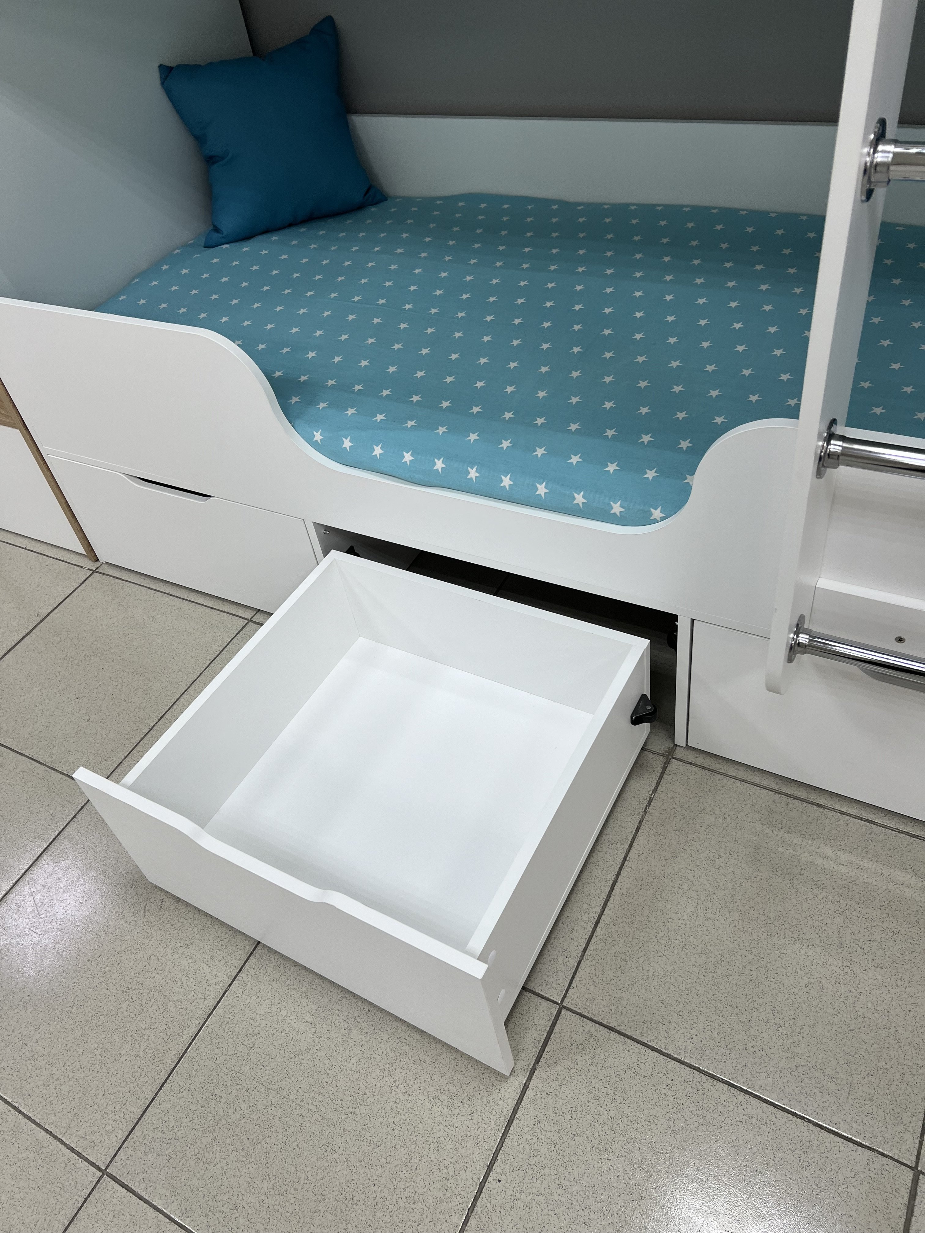 Кровать имеет три вместительных выдвижных ящика.
