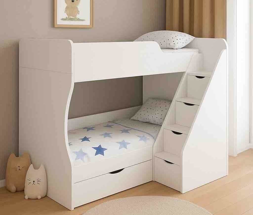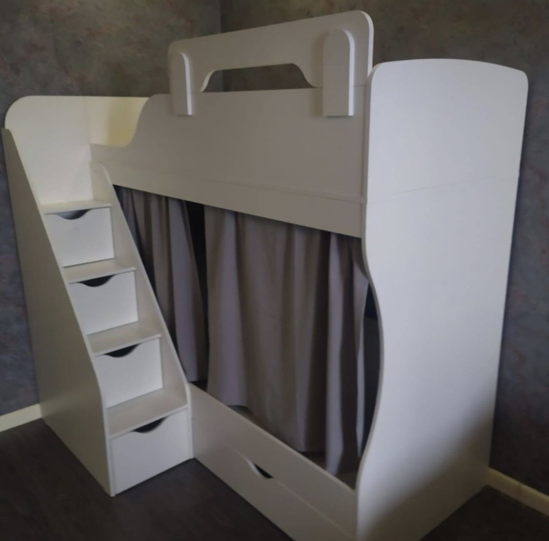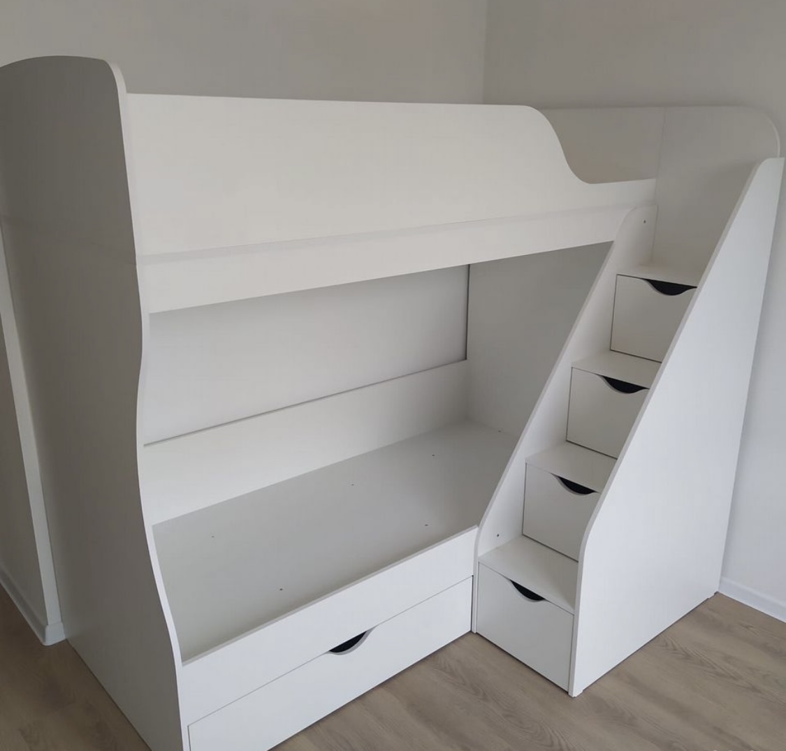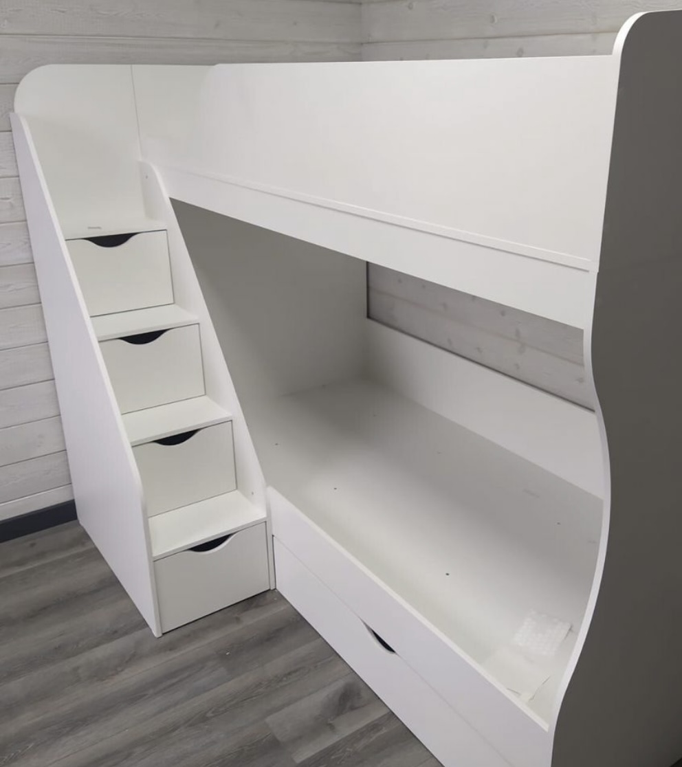 Высокая нагрузка на спальные места. Удобная лестница с ящиками. Высокий, прочный борт |