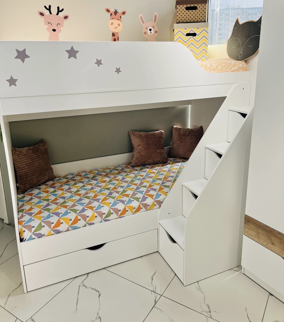 Преимущества данной модели - компактность и удобная, безопасная лестница с ящиками для игрушек и комфортная высота кровати.