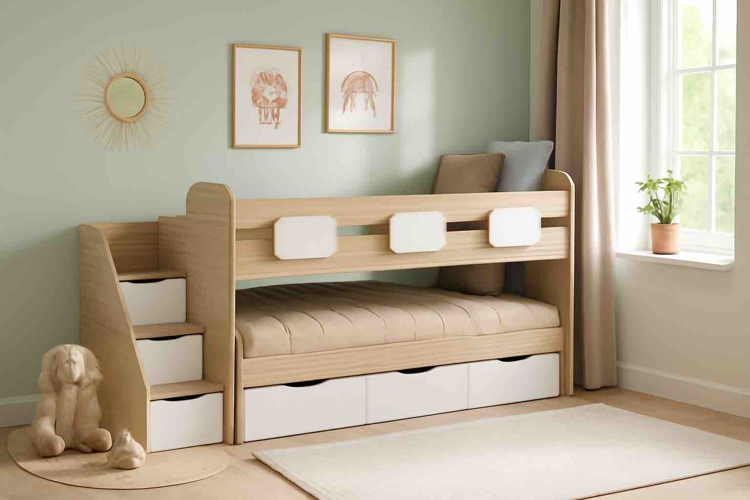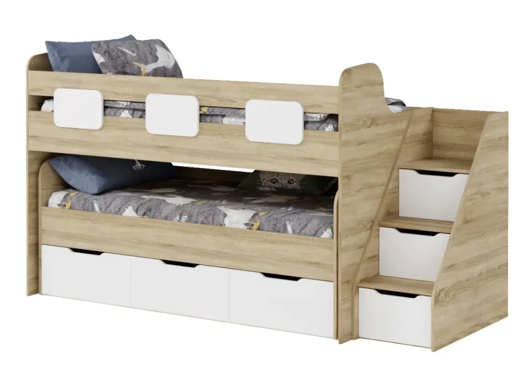 - Невысокая конструкция кровати обеспечивает удобный доступ на второй этаж, делая её идеальной даже для самых маленьких детей.