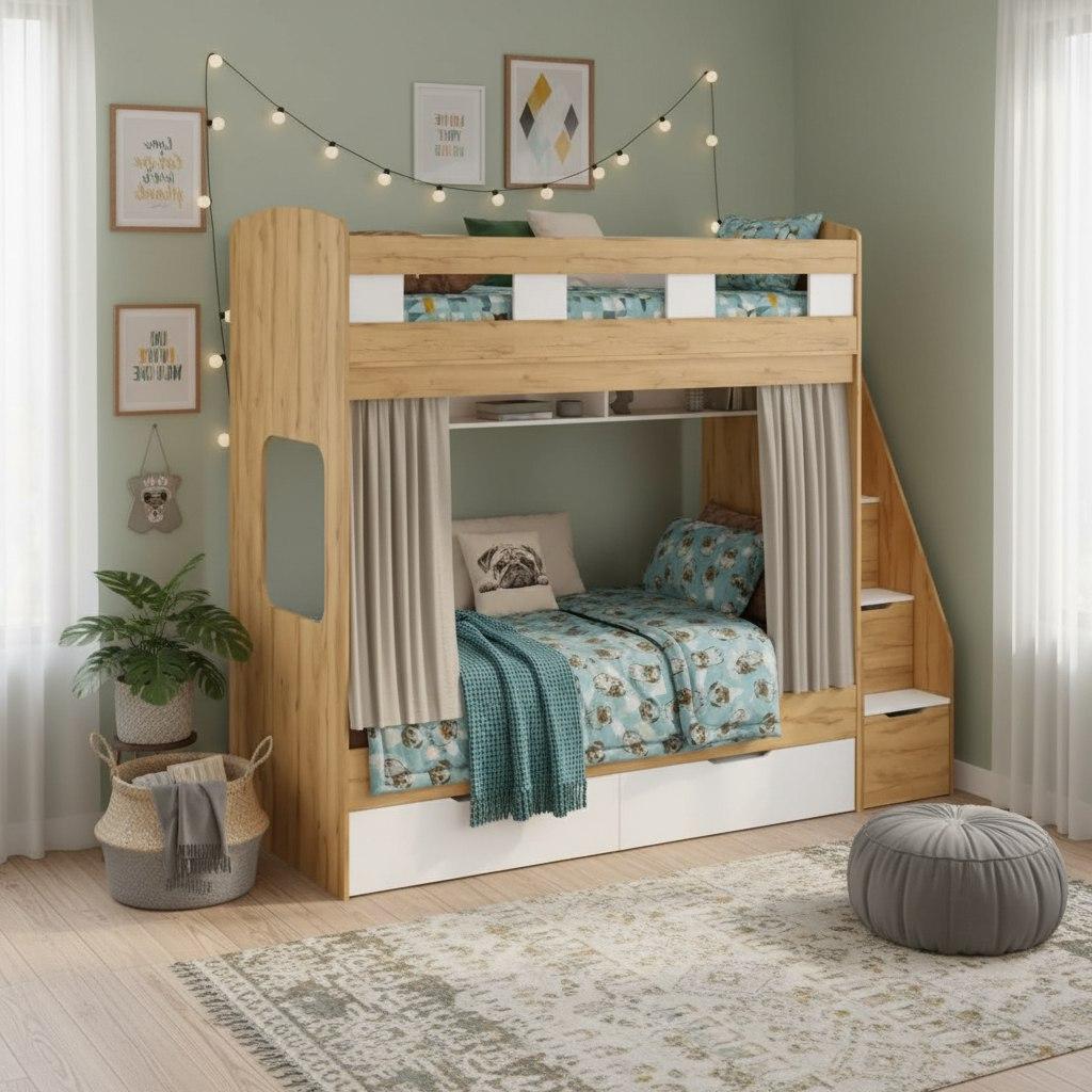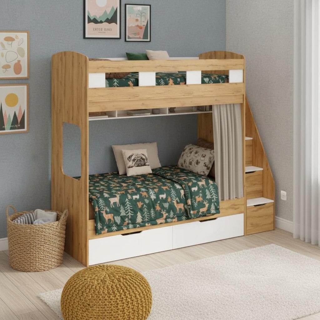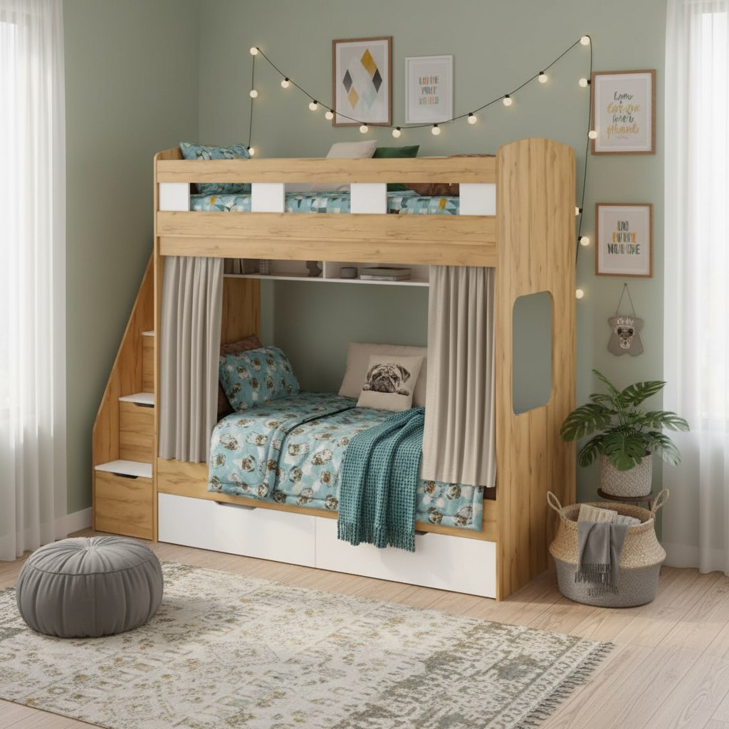 Прочная, стильная двухъярусная кровать Твинс с удобной лестницей, безопасным высоким бортиком и ящиками для хранения.