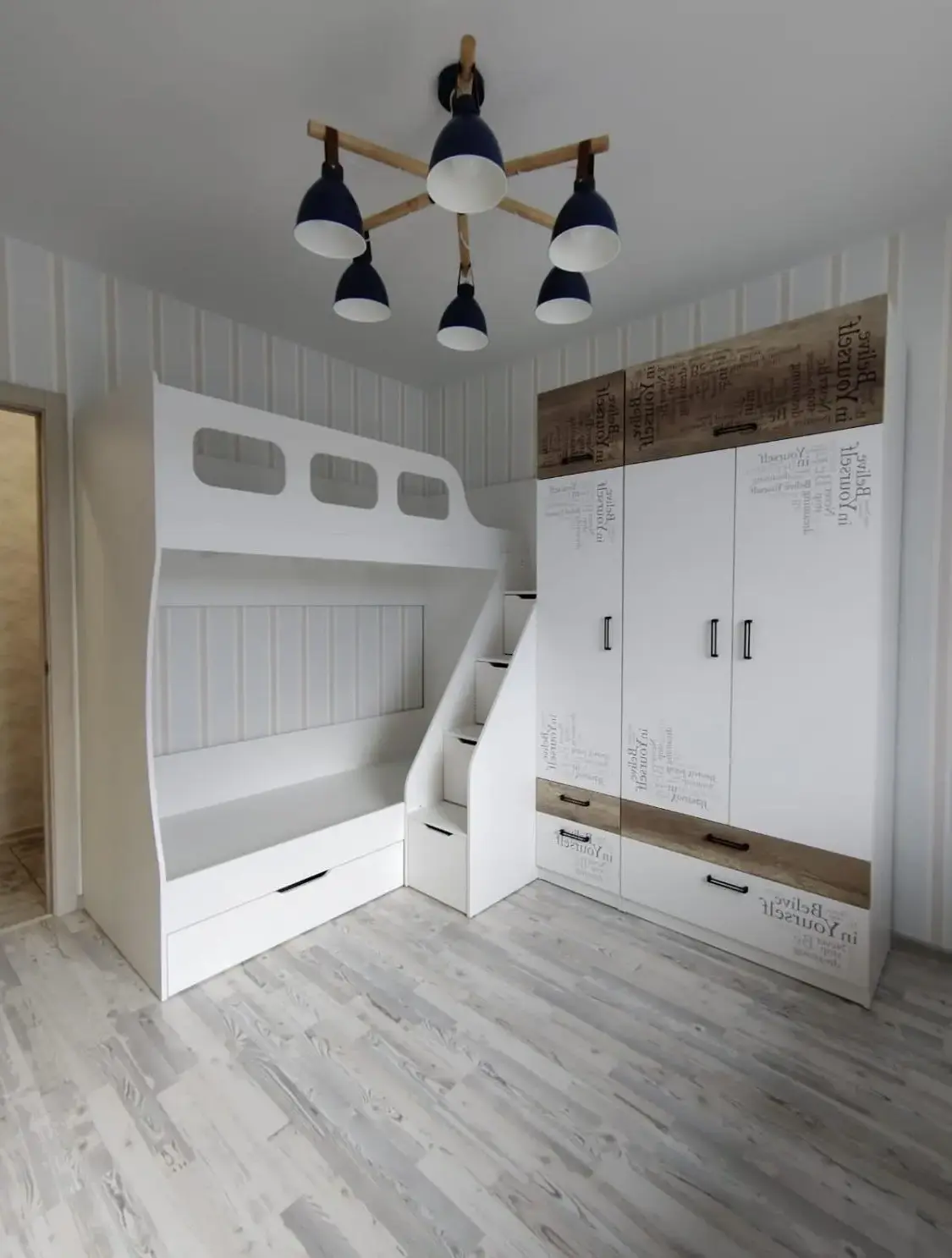 * В нижнюю кровать встроен выдвижной ящик для белья и игрушек.