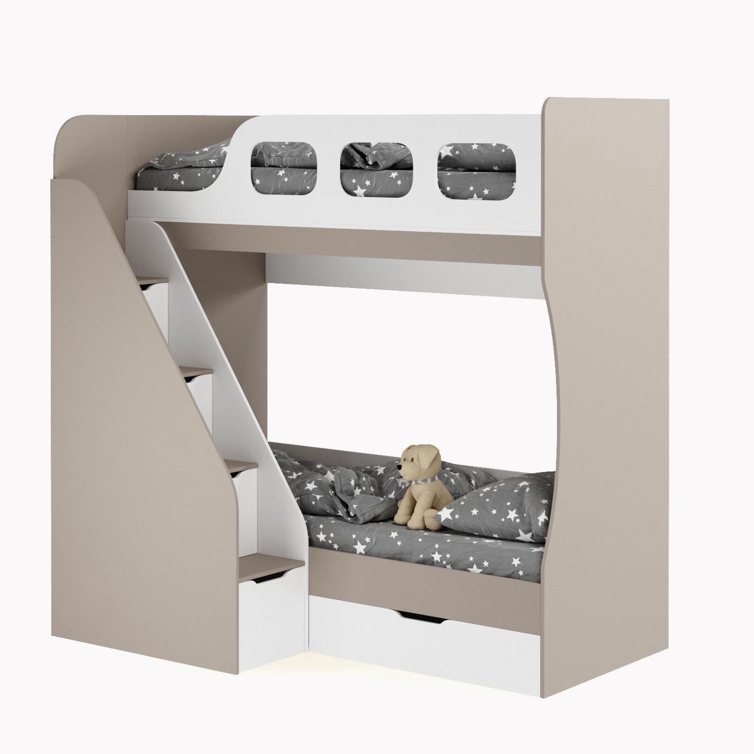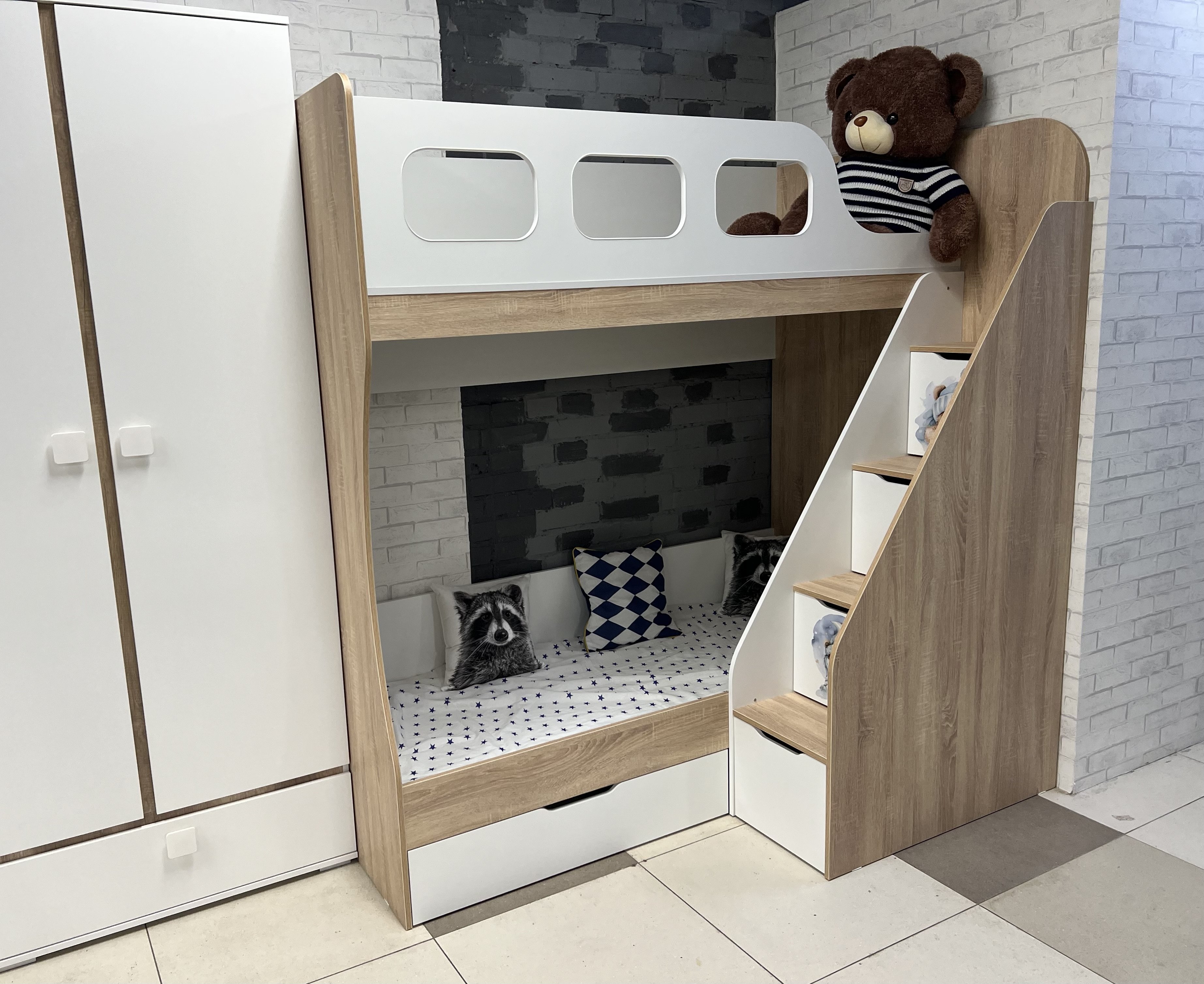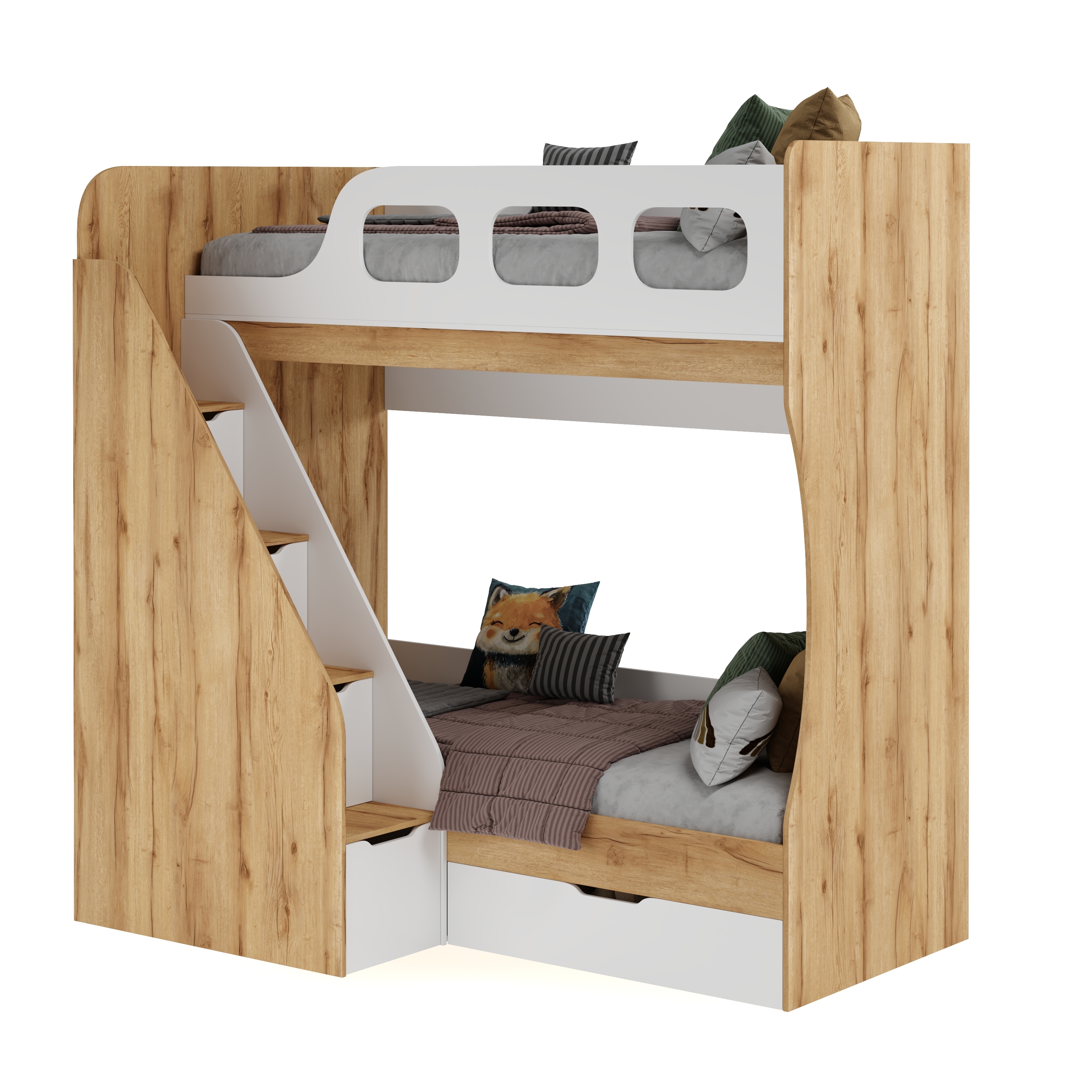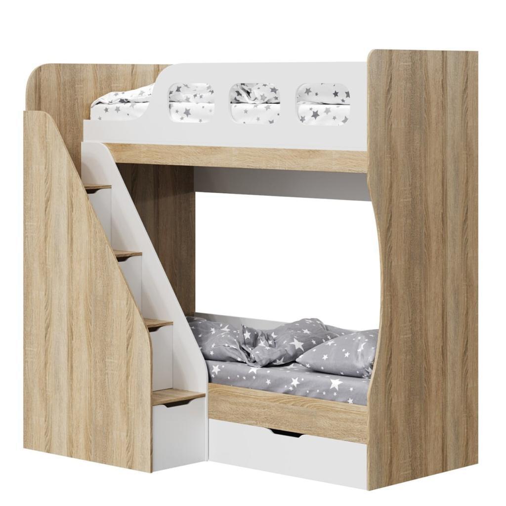 Высокая нагрузка на спальные места. Удобная лестница с ящиками. Высокий, безопасный бортик |