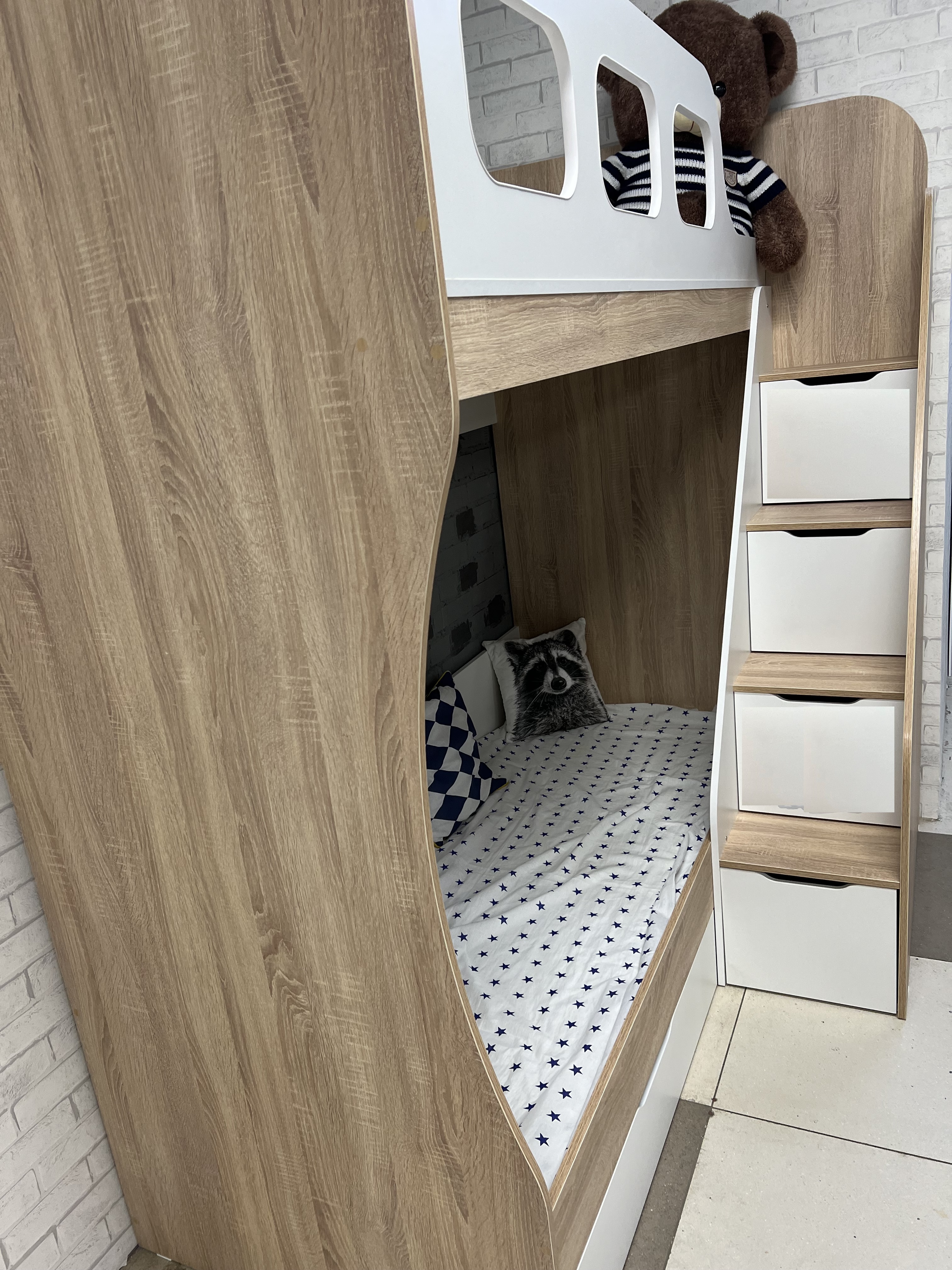 Преимущества данной модели - отлично подходит для небольших помещений, имеет удобную, безопасную лестницу с ящиками для игрушек.