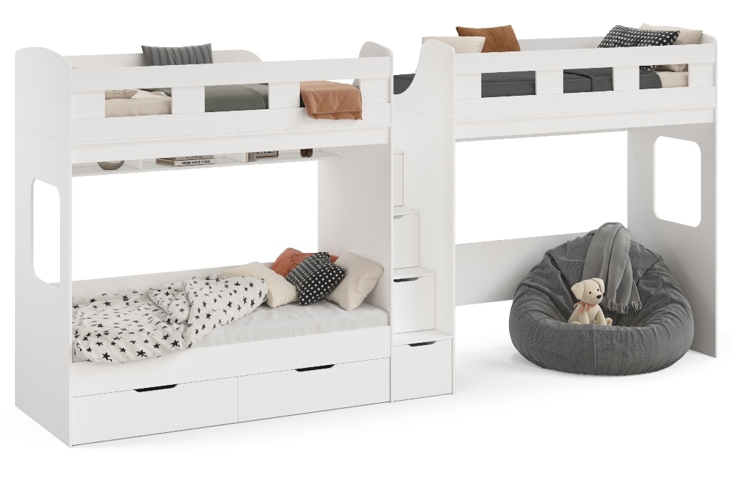Высокая нагрузка на спальные места. Удобная лестница-комод. Высокие, безопасные бортики |
