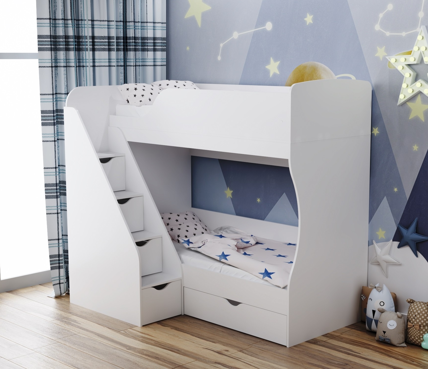 Высокая нагрузка на спальные места. Удобная лестница с ящиками. Высокий безопасный борт |