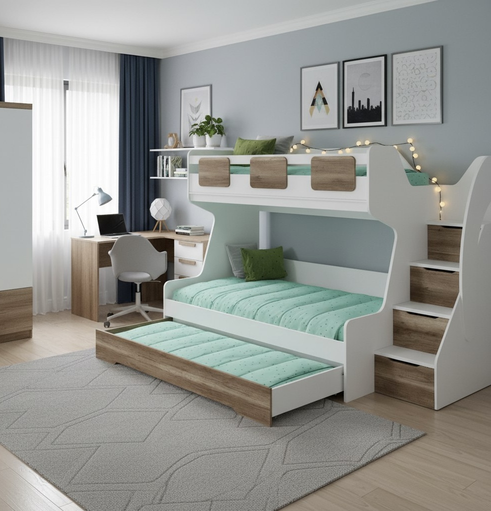 Увеличенное, просторное нижнее спальное место позволяет комфортно разместиться ребенку вместе со взрослым.