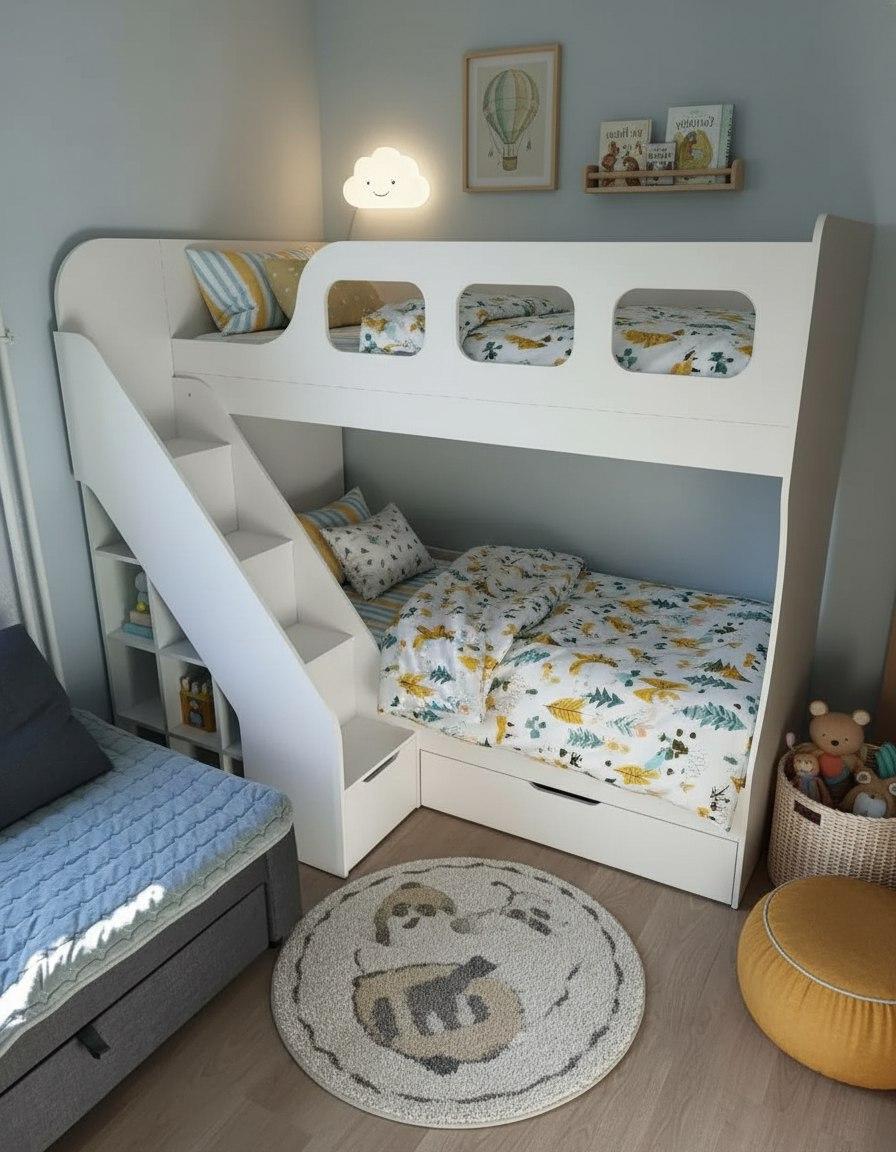 Высокая нагрузка на спальные места. Удобная лестница. Высокий, безопасный борт |