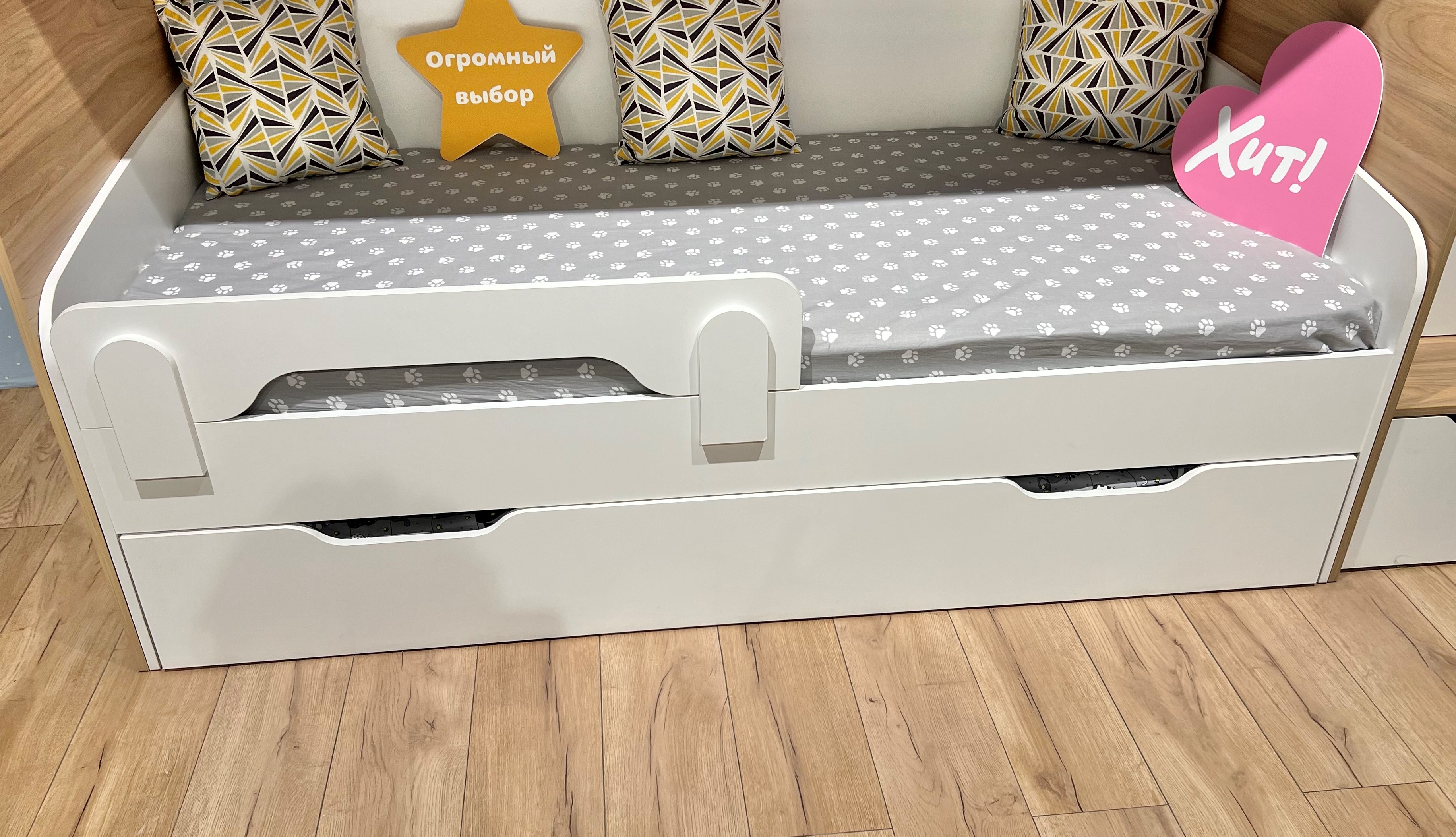 Экономия пространства:выдвижное спальное место легко убирается под основную кровать, освобождая место для игр и активного отдыха.