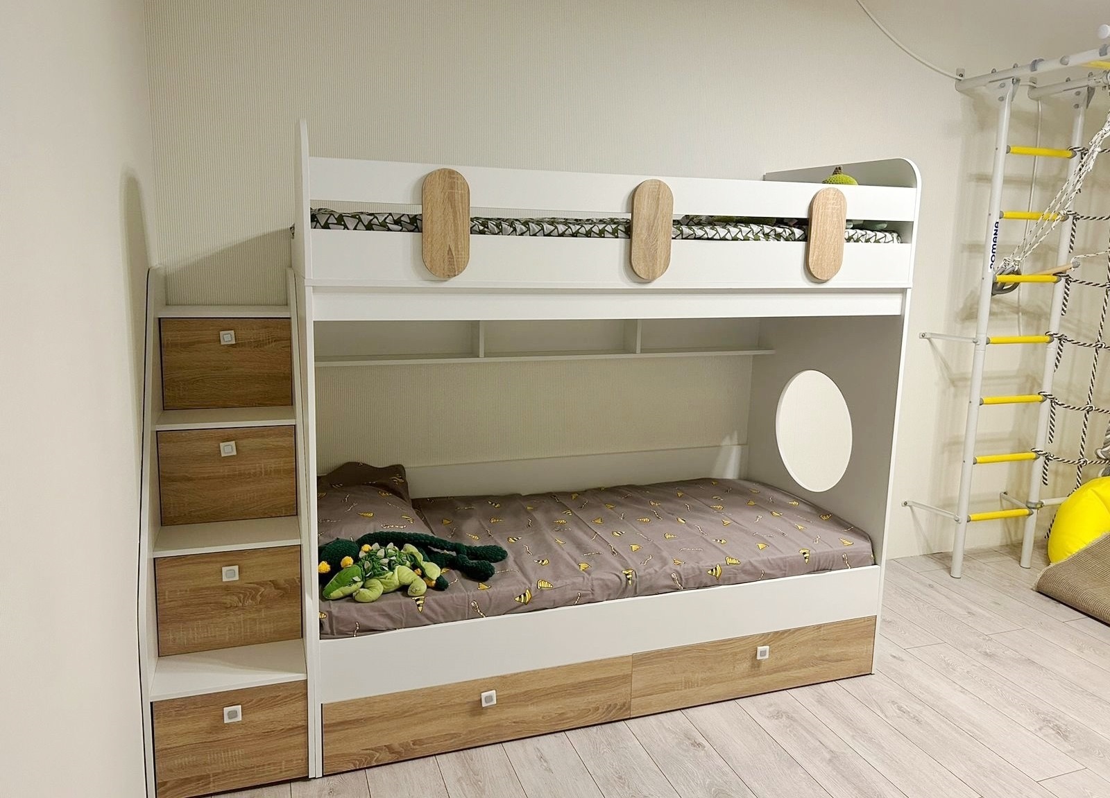 В лестницу встроены ящики для игрушек.