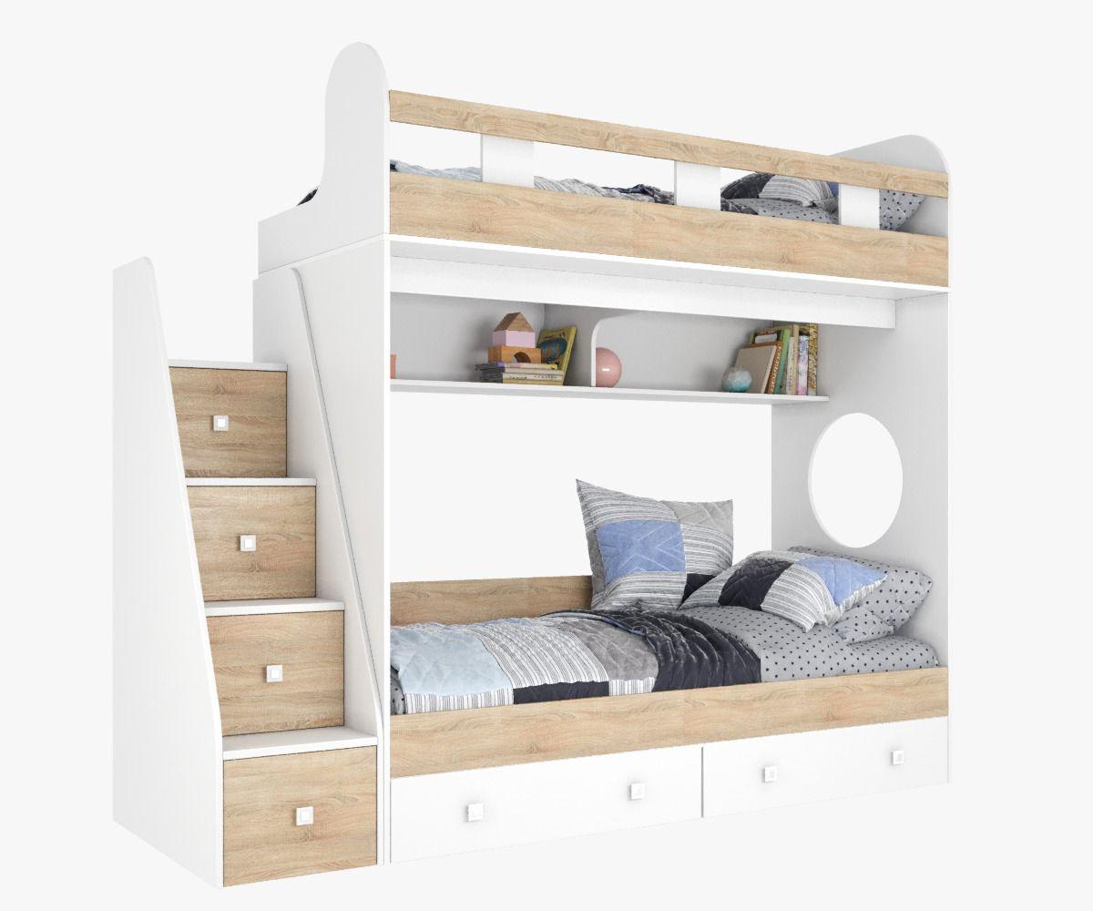 спальное место для двоих, навесная полка для книг и игрушек, вместительные выдвижные ящики под кроватью, а также безопасная лестница, обеспечивающая быстрый и удобный доступ на второй этаж.
