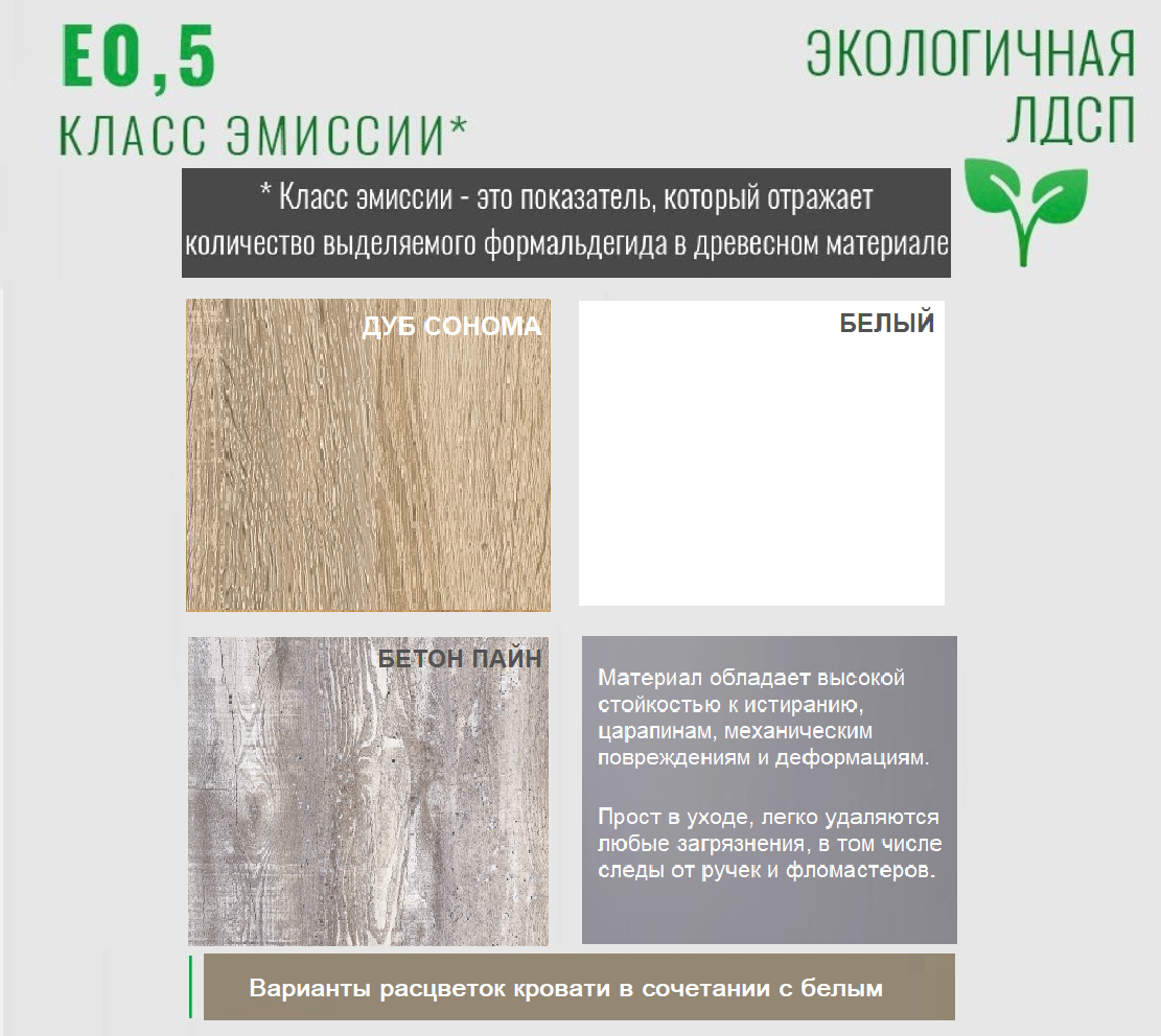 ЛДСП Е0,5. Толщина 16 мм. Кровать доступна в расцветках: полностью белый, дуб сонома+белый, бетон пайн+белый |