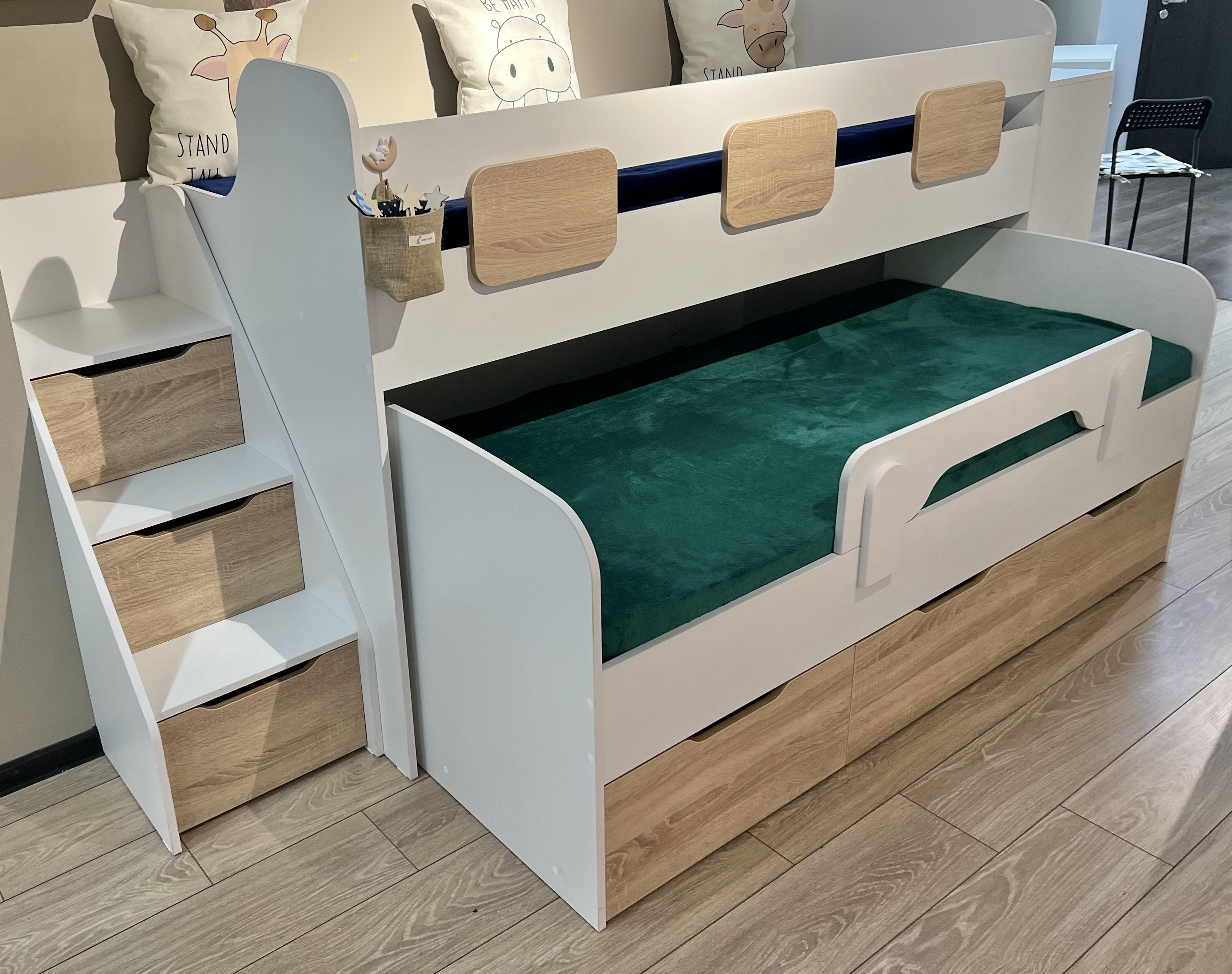 Кровать имеет три выдвижных ящика для хранения белья и игрушек (ящики на шариковых направляющих скрытого монтажа с доводчиками).
