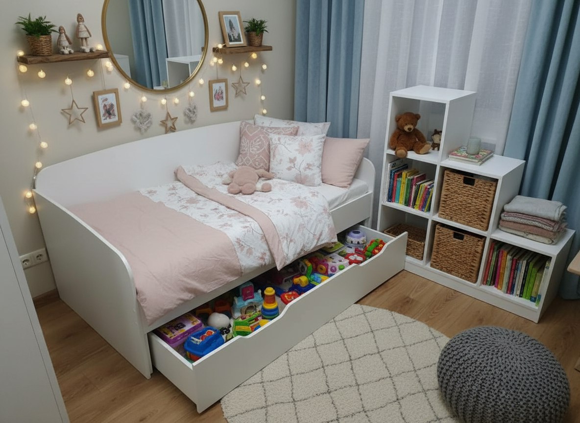 Нижняя кровать на выкатных роликах (при желании кровать можно выдвинуть полностью и поставить в другое место).