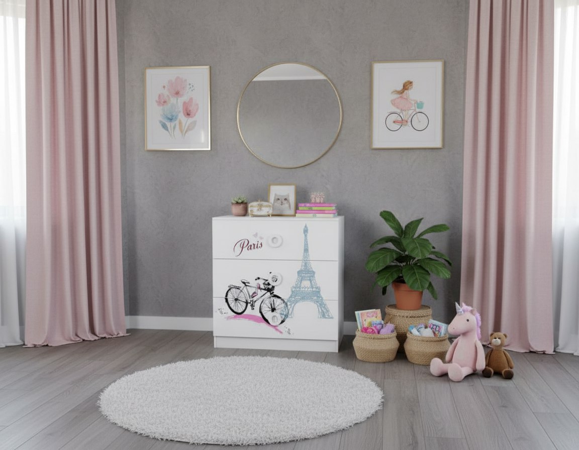 Комод выполнен из сертифицированного, качественного, экологически чистого ЛДСП е0,5 в белом цвете с дизайнерским принтом на фасадах.
