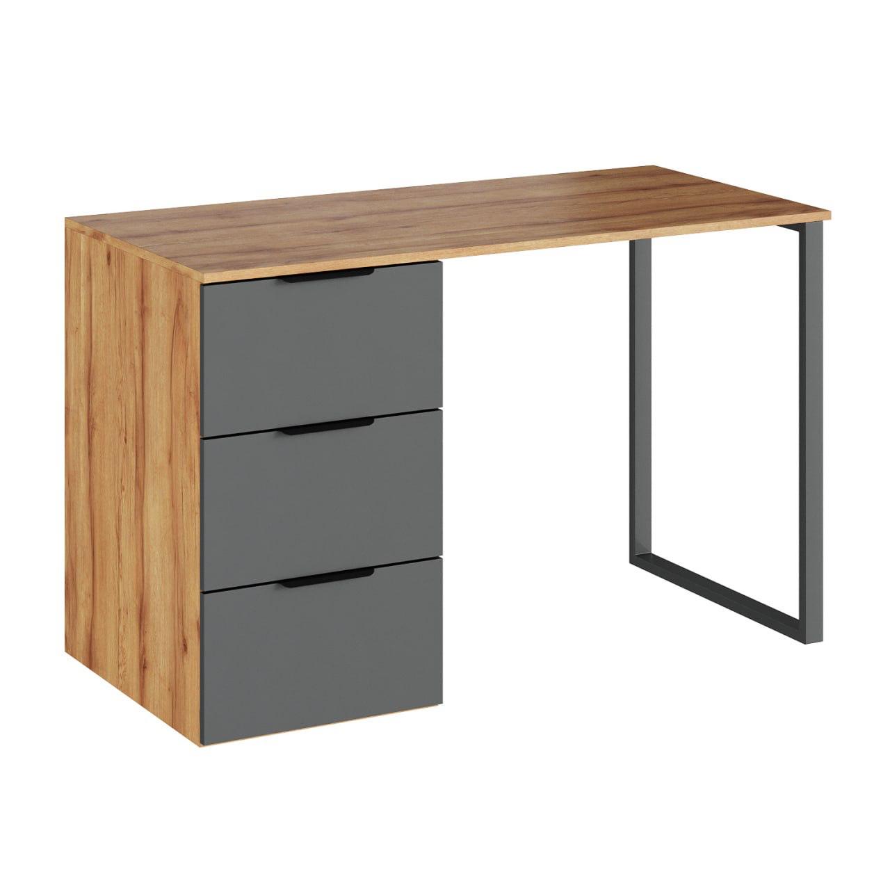 Натуральный декор дуб золотистый с выразительными полосами и следами от сучков прекрасно сочетается с однотонным декором графит.