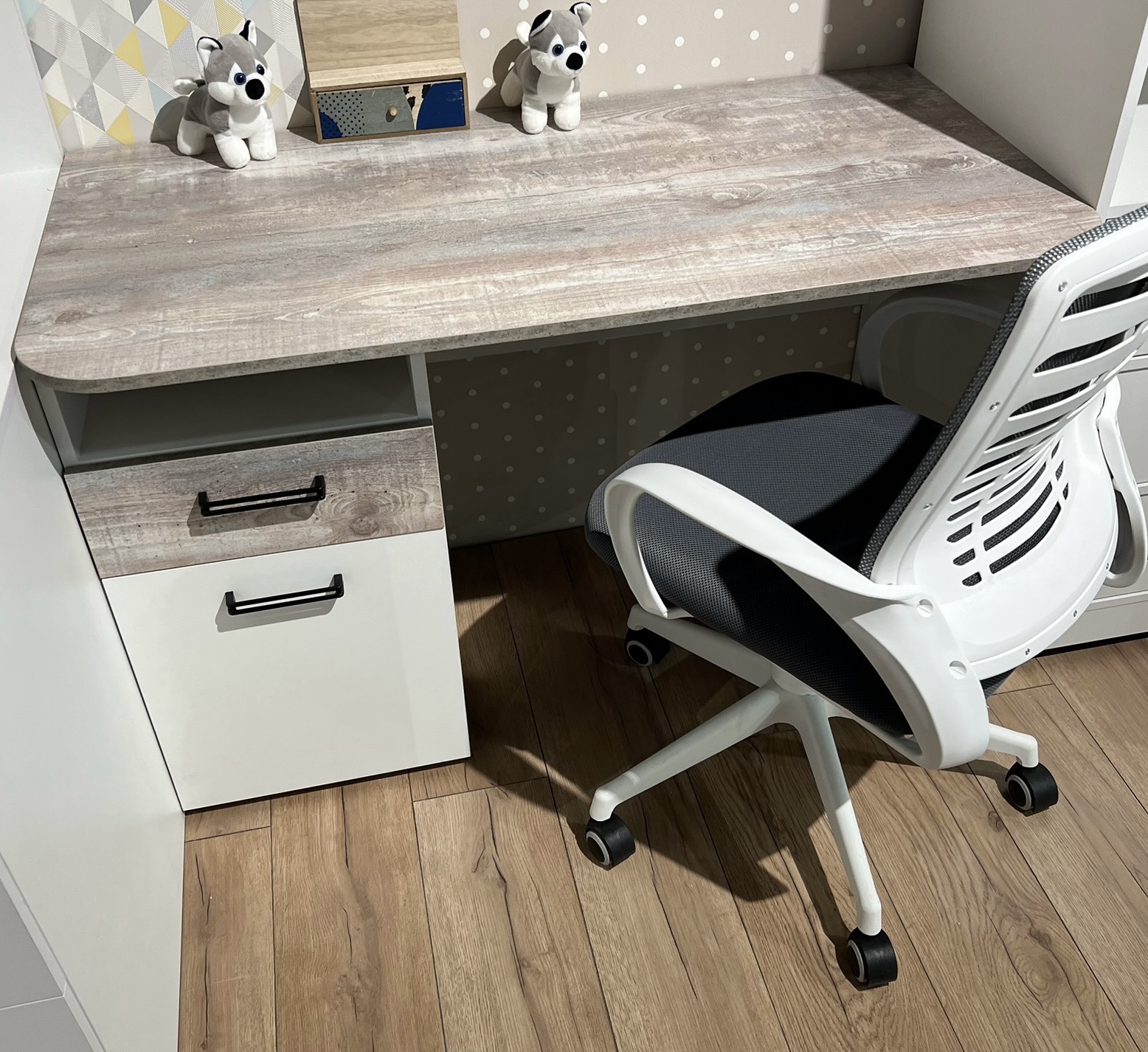 Мебель выполнена из сертифицированного, качественного, экологически чистого ЛДСП класса Е0,5 в сочетании цветов "бетон пайн" + белый.