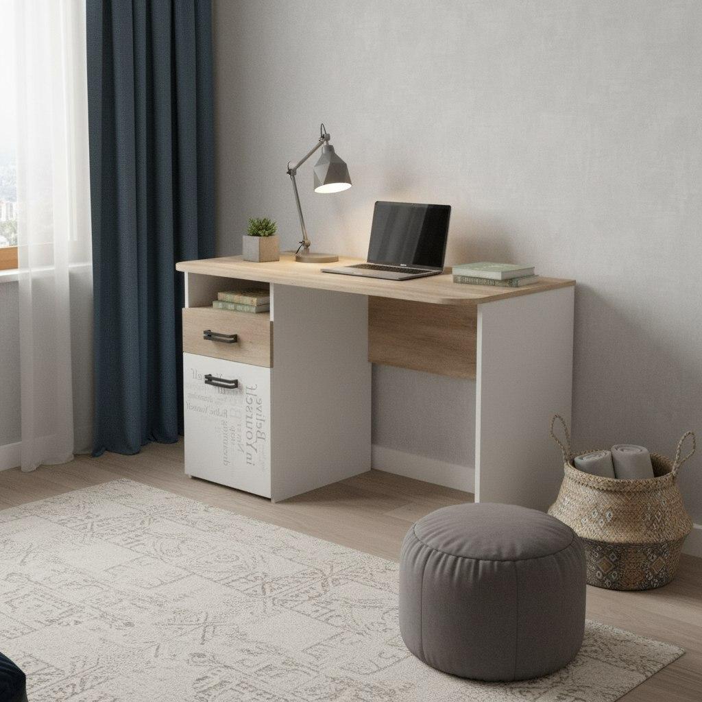 ЛДСП класса Е0,5 в сочетании цветов "дуб каньон + белый" и оформлена дизайнерским принтом.