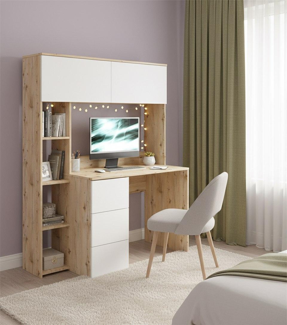 Просторная поверхность, удобные полки и ящики позволят разместить учебники, книги и канцелярию.