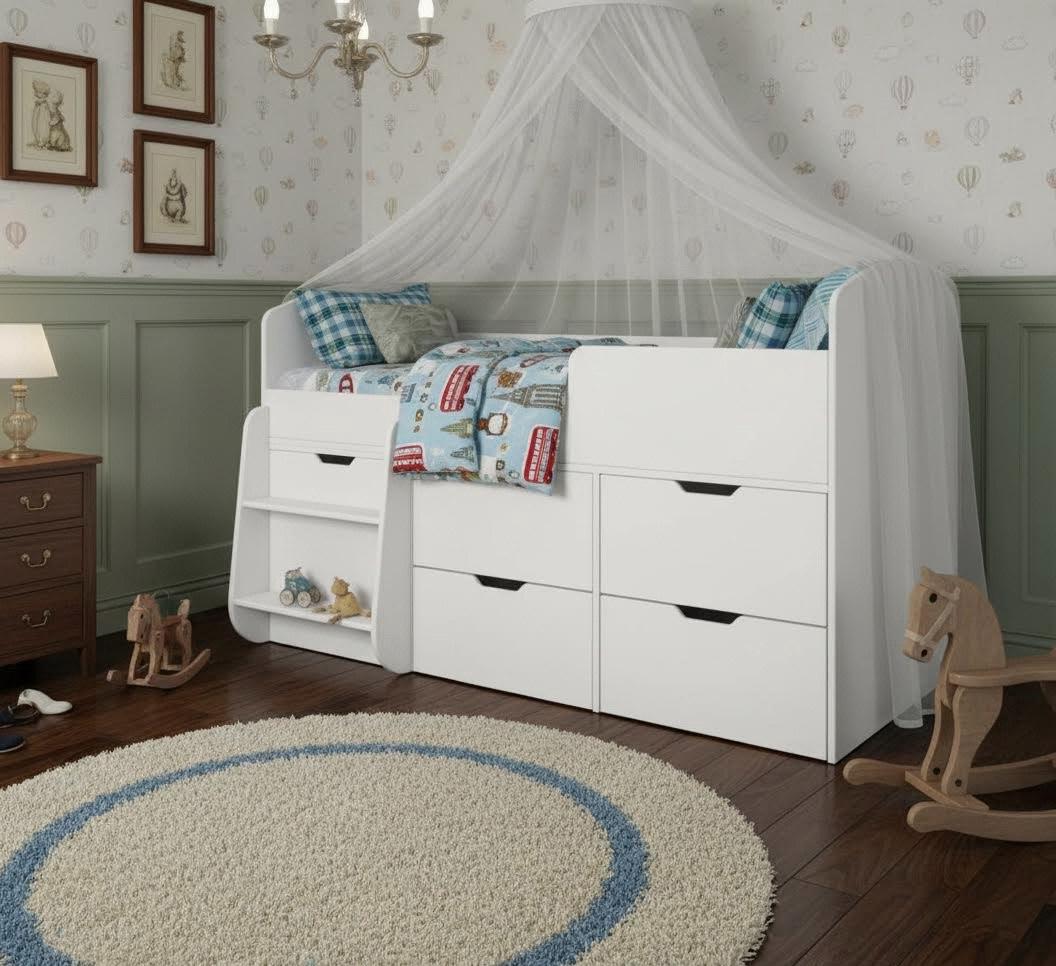 Безопасные бортики, удобная выдвижная лестница с внутренними полочками и небольшая высота кровати сделаны специально для детей младшего возраста.