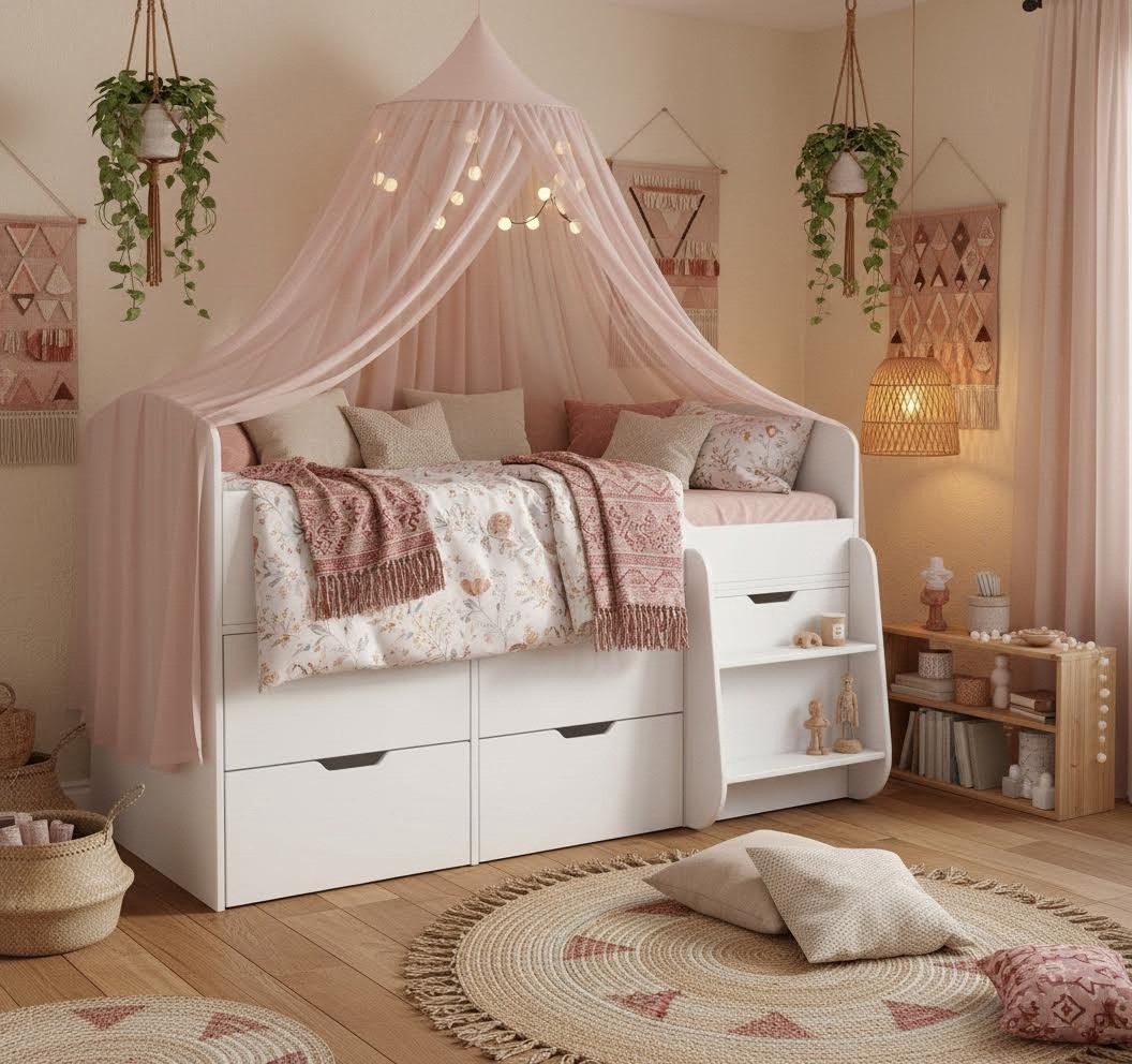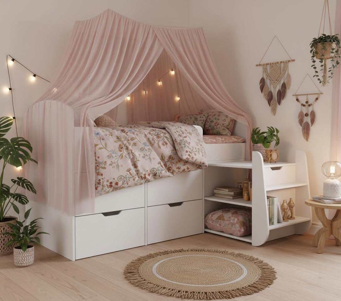 Четыре выдвижных ящика помогут ребенку хранить личные вещи и игрушки в собранном виде.