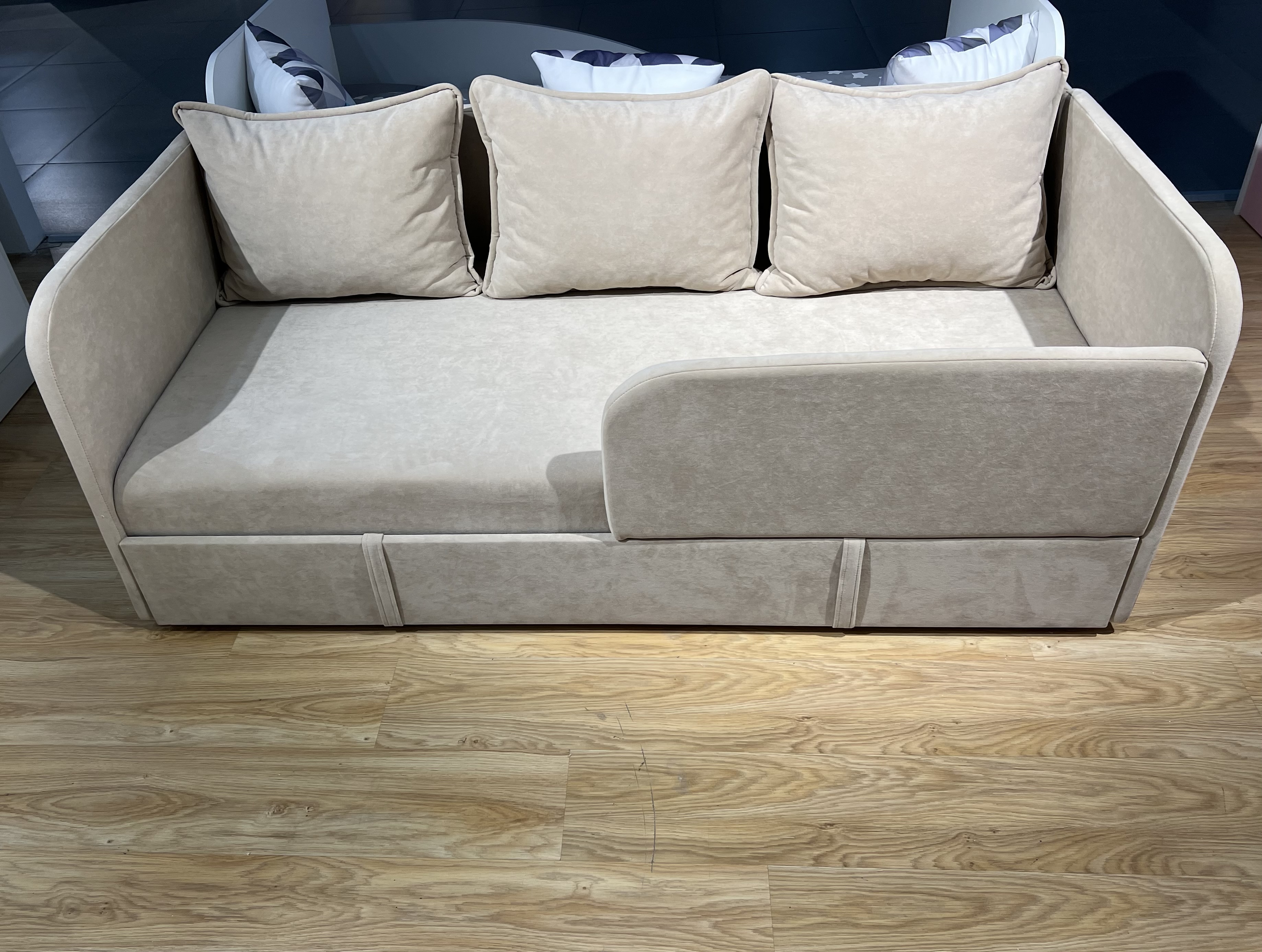 Диванчик подойдет и для самых маленьких деток, так как имеет защитный бортик.