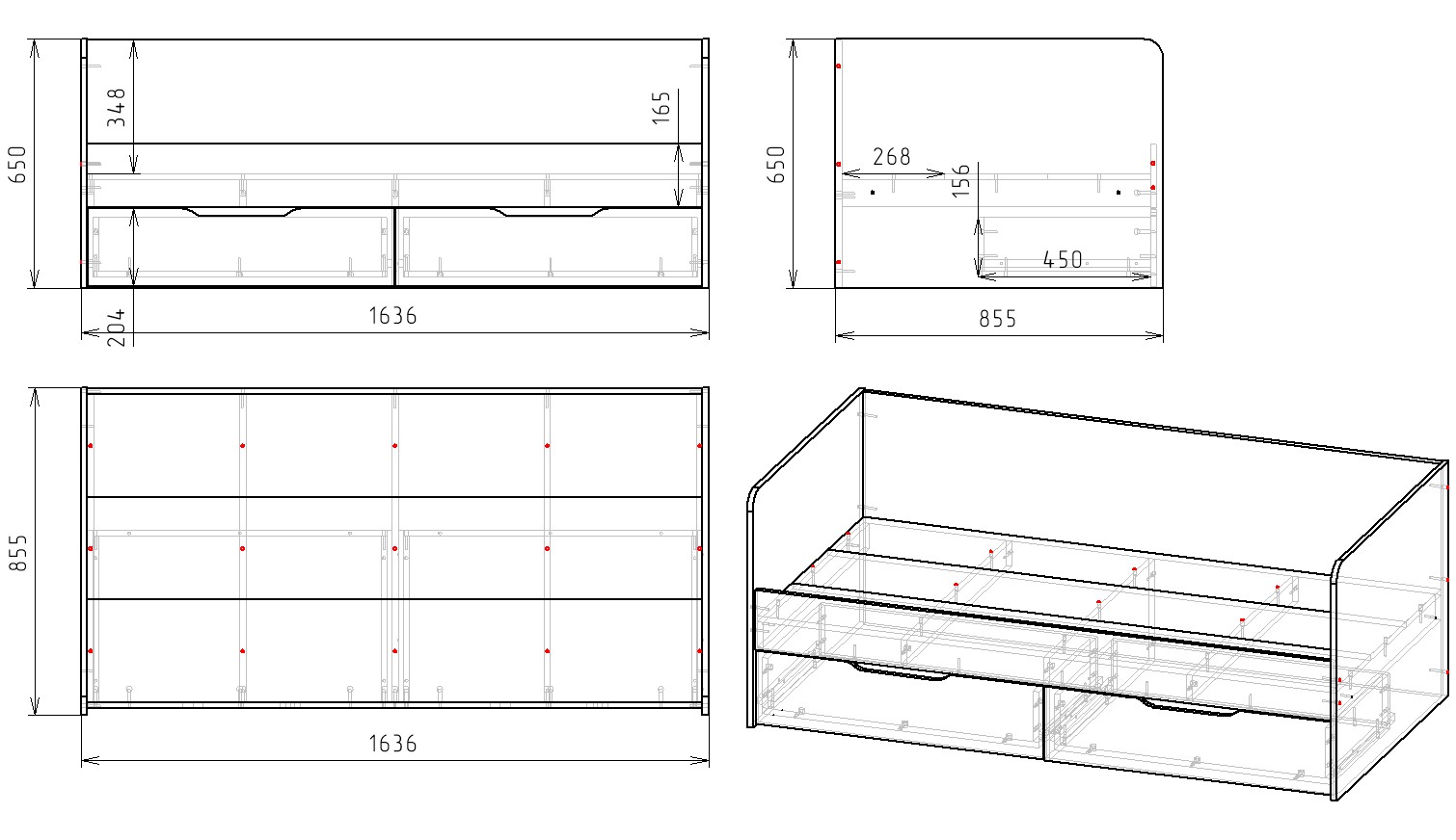 Габариты кровати: ширина 1636, высота 650, глубина 855 мм