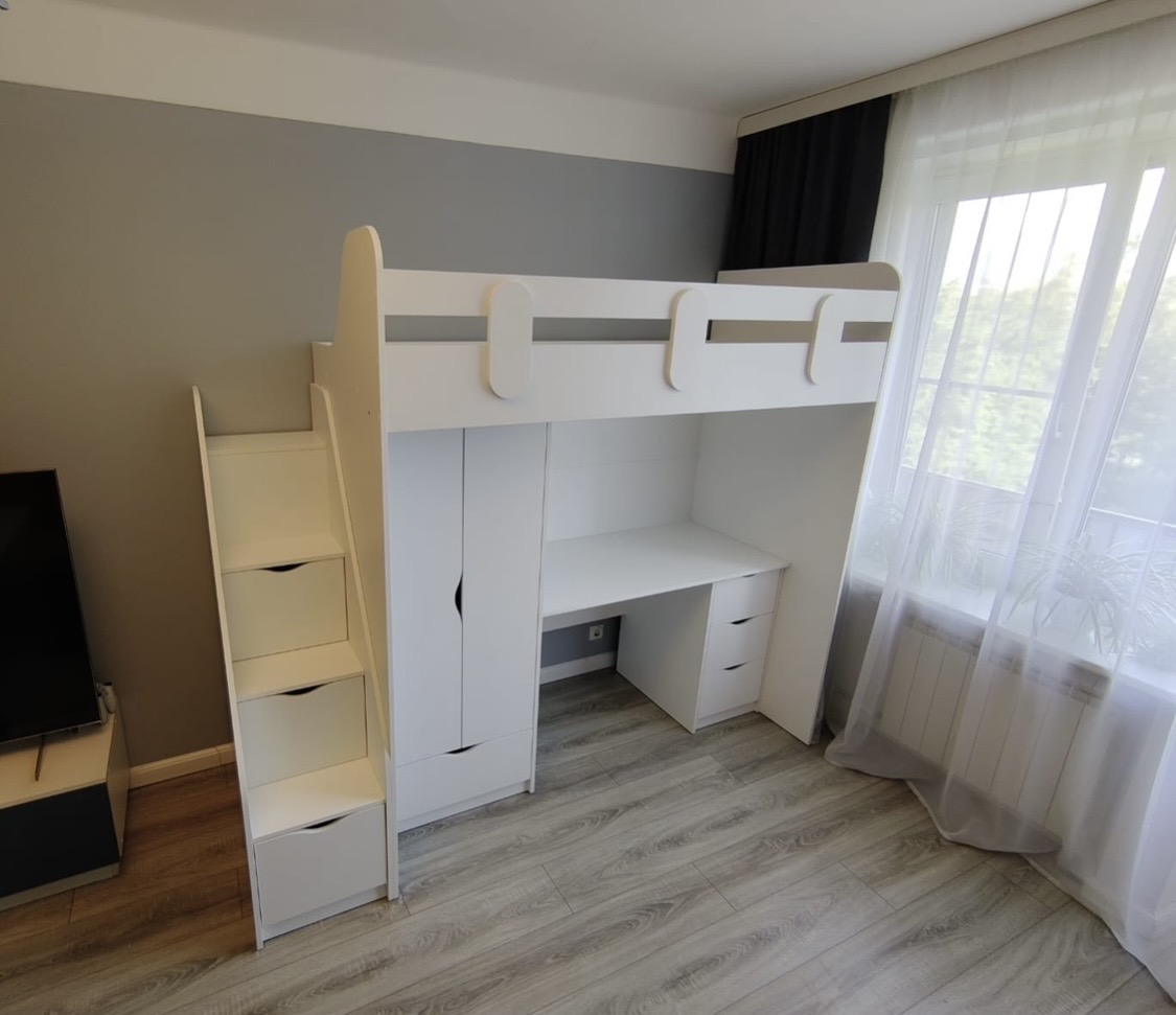 <comment>Так как в комнате мало места, пришлось совместить два чердака и оставить одну лестницу. Очень удобно, что сразу получился полноценный набор для каждого ребенка. Кровать, стол, шкафчик. Очень функционально. Дети довольны! Спасибо </comment>
