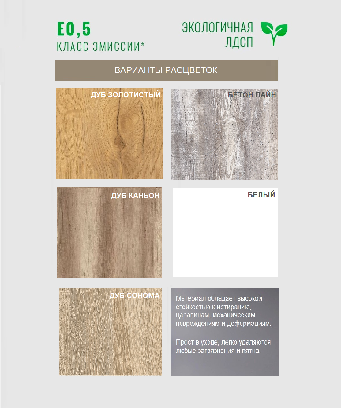 ЛДСП Е0,5. Толщина 16 мм. ДОСТУПНА В РАСЦВЕТКАХ: белый, дуб сонома, бетон пайн, дуб каньон, дуб золотистый