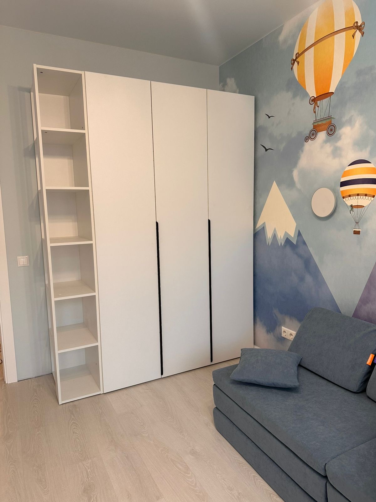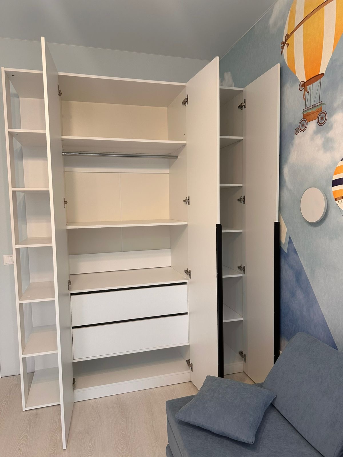 Шкаф имеет три распашные двери, которые оснащены доводчиками для плавного и бесшумного закрывания.