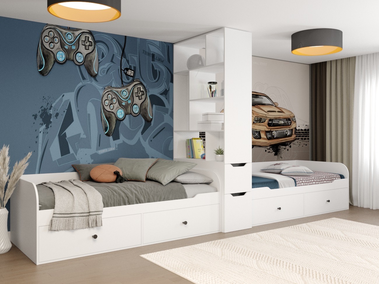 кровать (2 шт) + стеллаж для зонирования