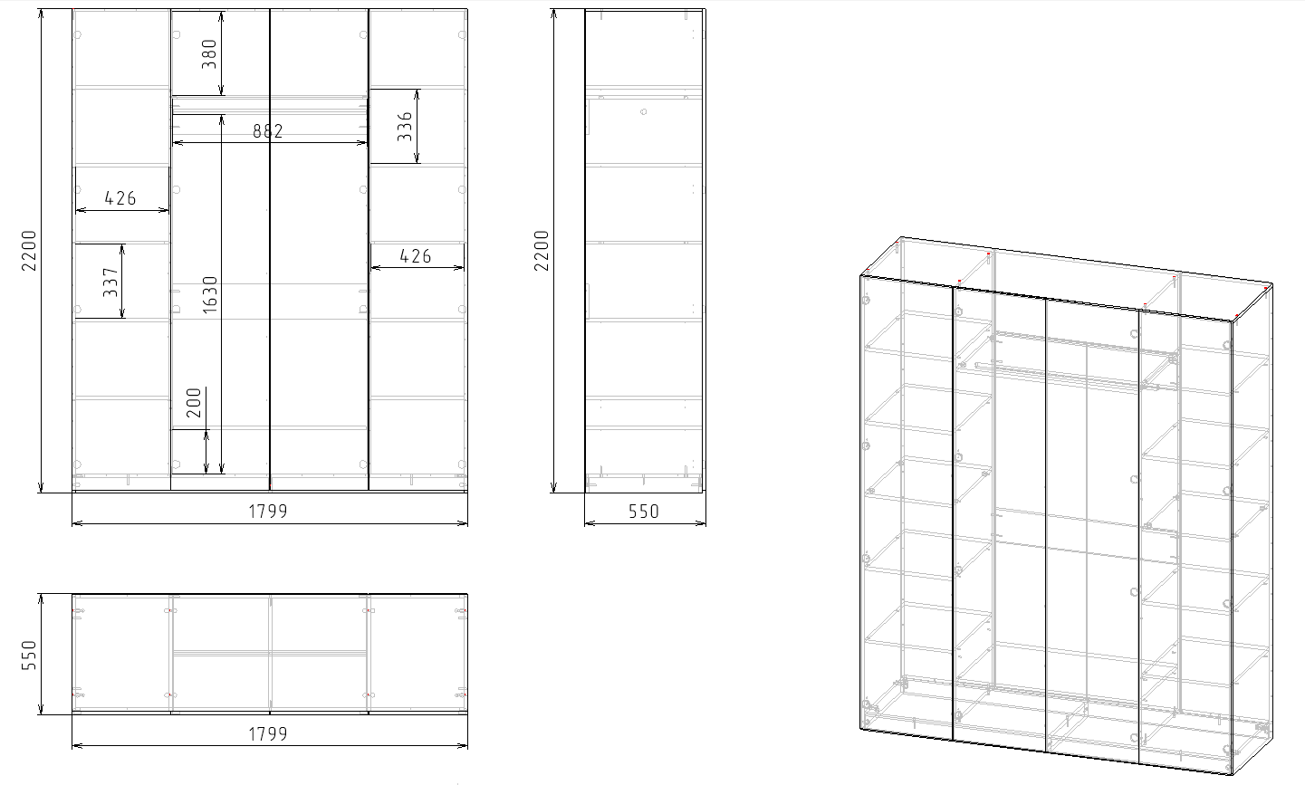 высота 2200 х ширина 1799 х глубина 550 мм
