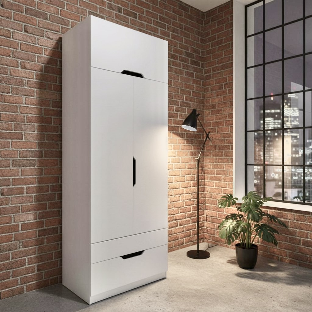 Внутри шкафа имеется штанга и боковые полки.