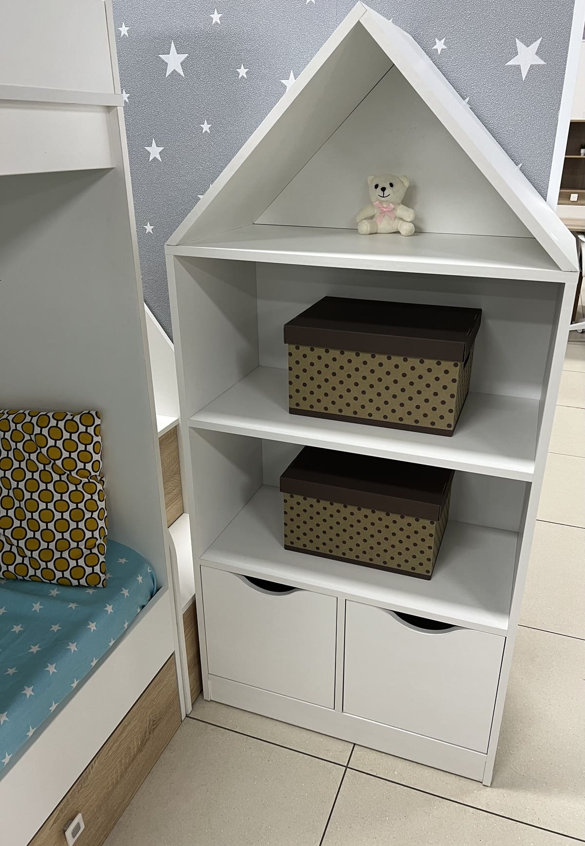 Стеллаж в виде домика - оригинальное и практичное дополнение в интерьере детской комнаты.