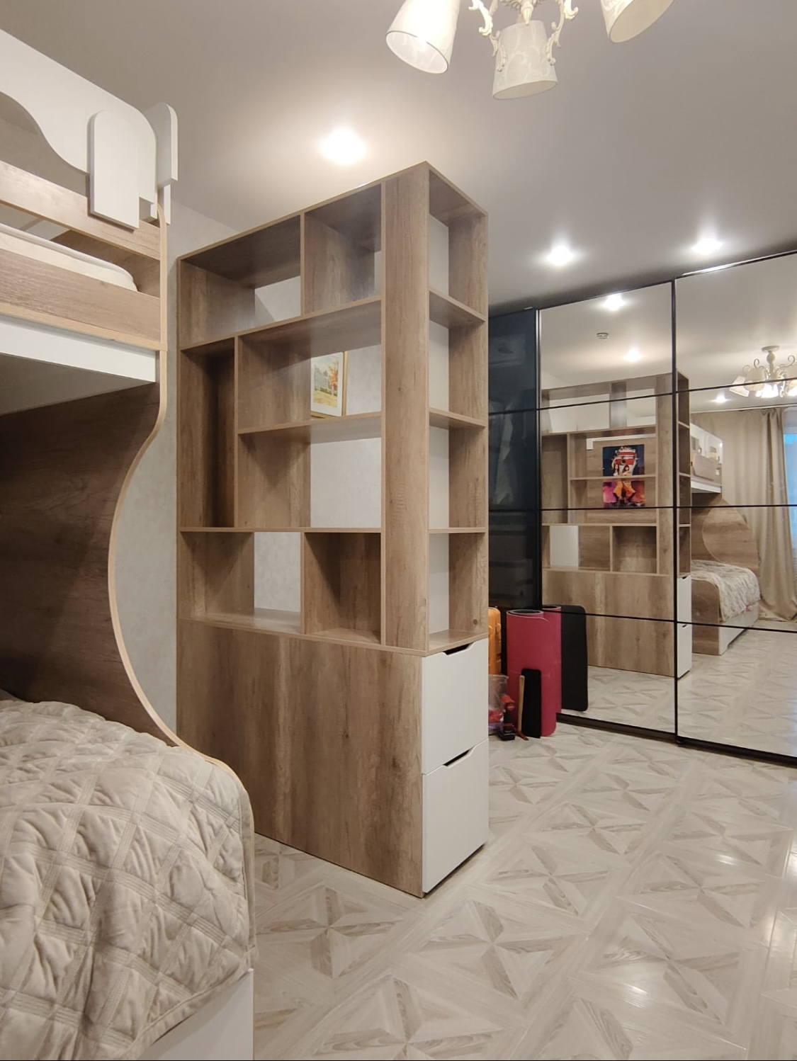 С помощью стеллажа можно разделить комнату на отдельные зоны: отдыха, учебы, встречи с друзьями, можно зонировать комнату для двоих детей.