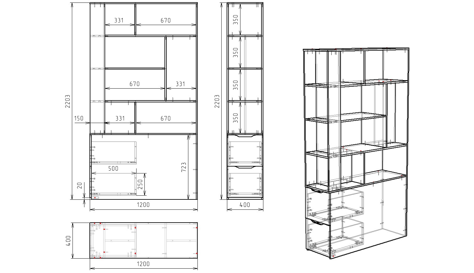 * В стеллаж встроены два выдвижных ящика на шариковых направляющих.
