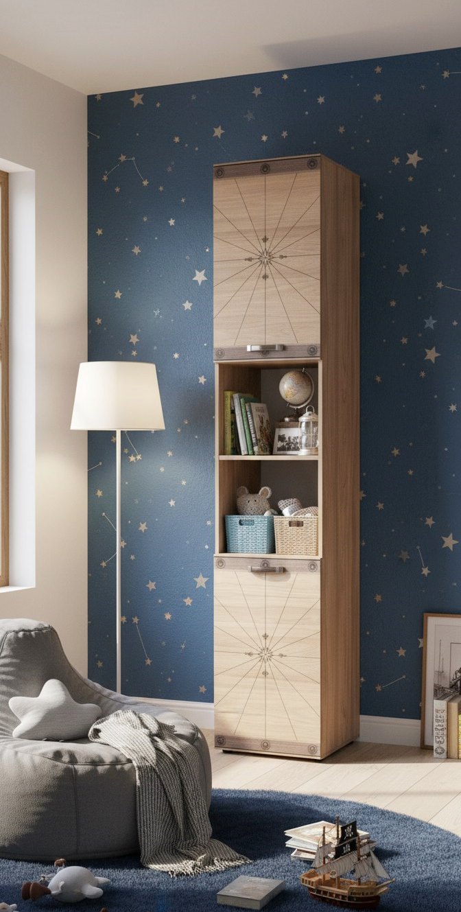 Стеллаж выполнен из сертифицированного, качественного, экологически чистого ЛДСП Е0,5 в цвете "швейцарский вяз" с дизайнерским принтом на фасадах.