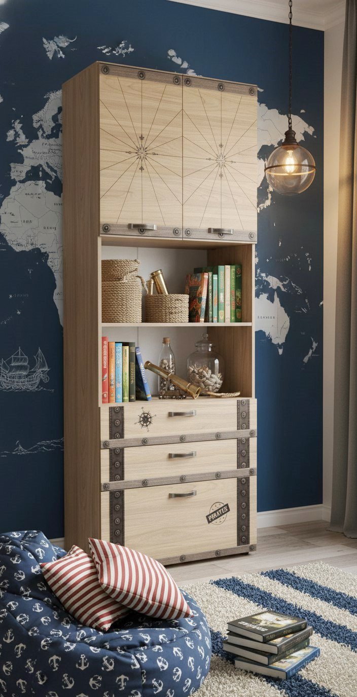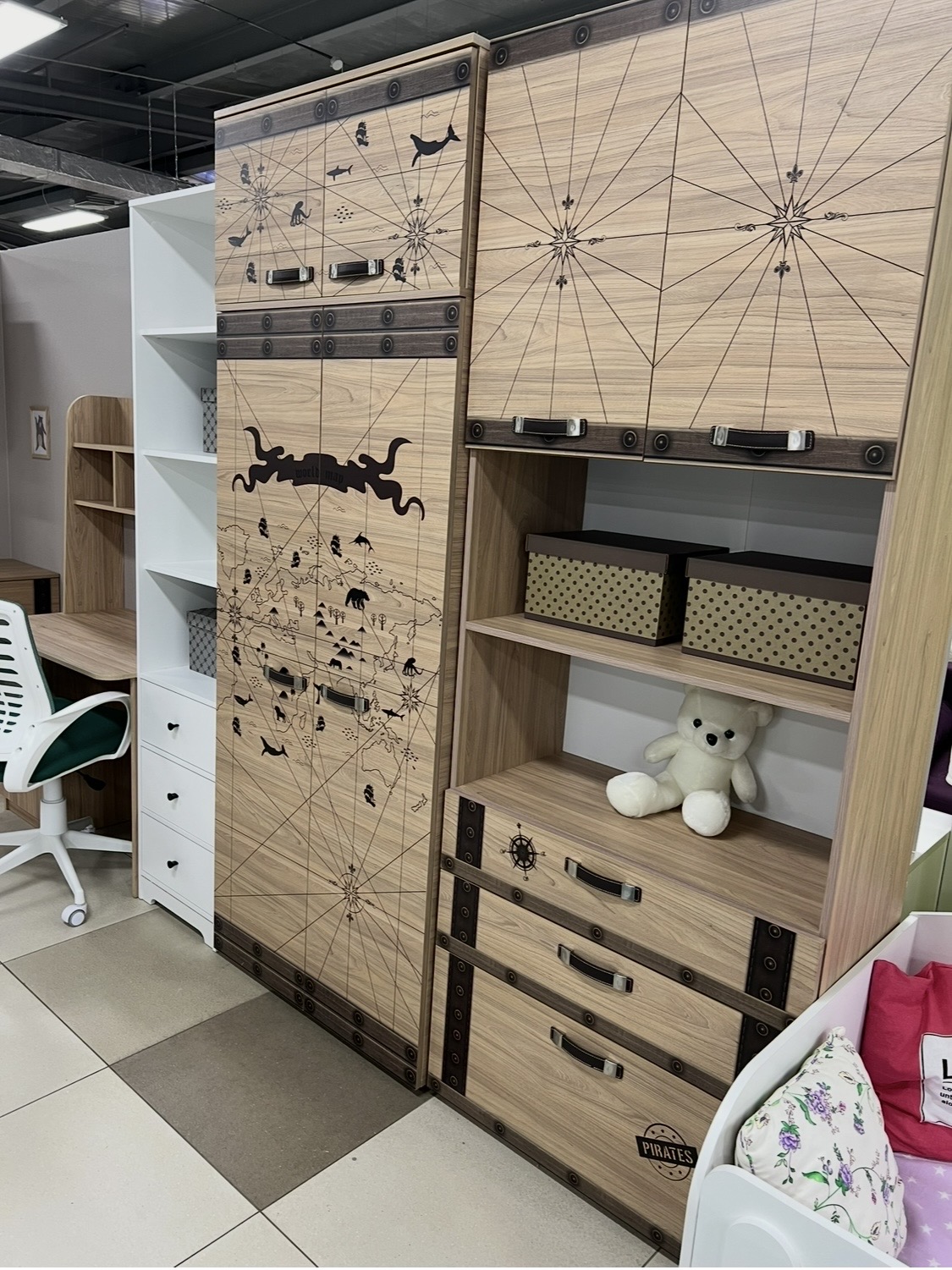 Стеллаж выполнен из сертифицированного, качественного, экологически чистого ЛДСП Е0,5 в цвете "швейцарский вяз" с дизайнерским принтом на фасадах.