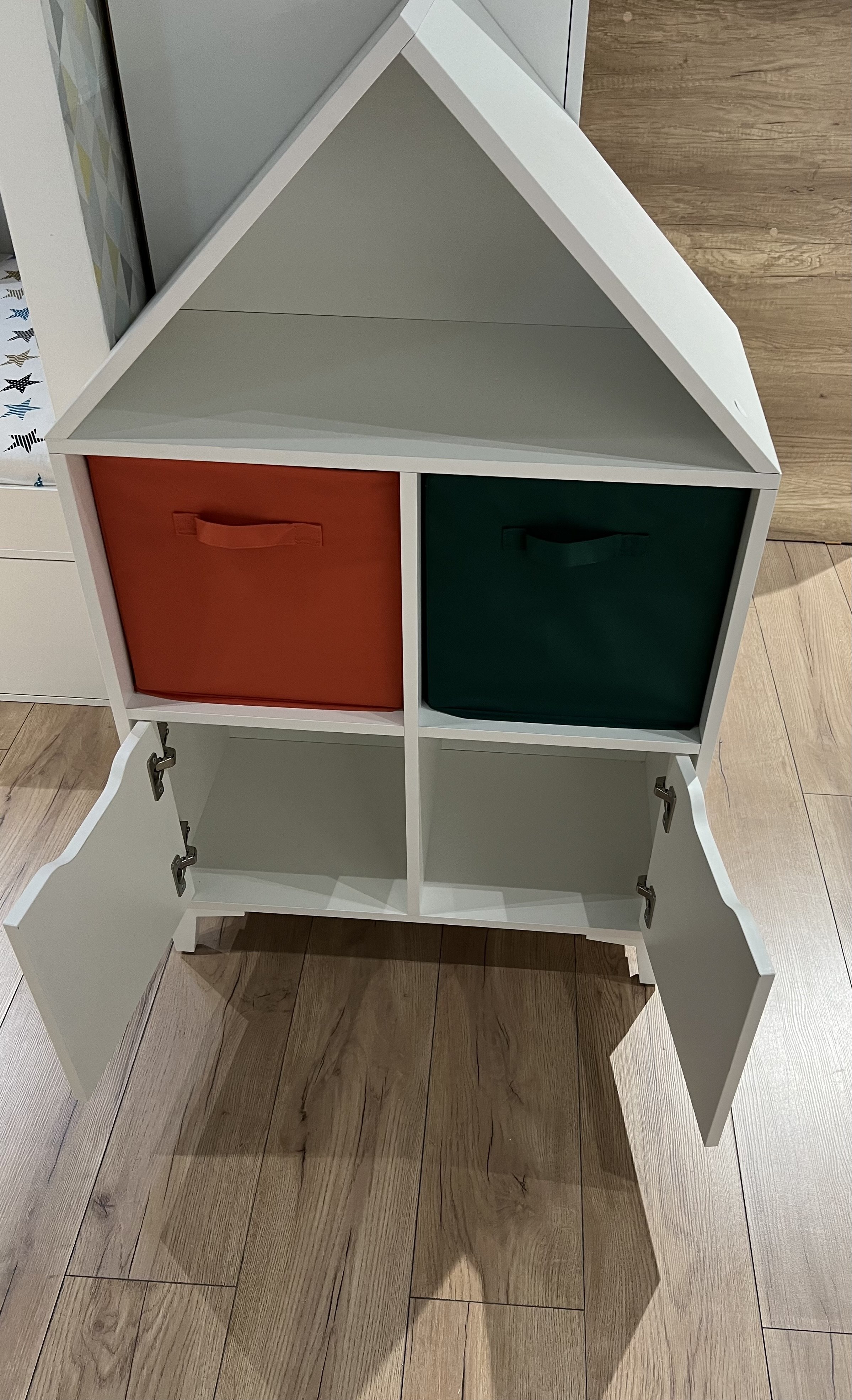 Стеллаж в виде домика - оригинальное и практичное дополнение в интерьере детской комнаты.