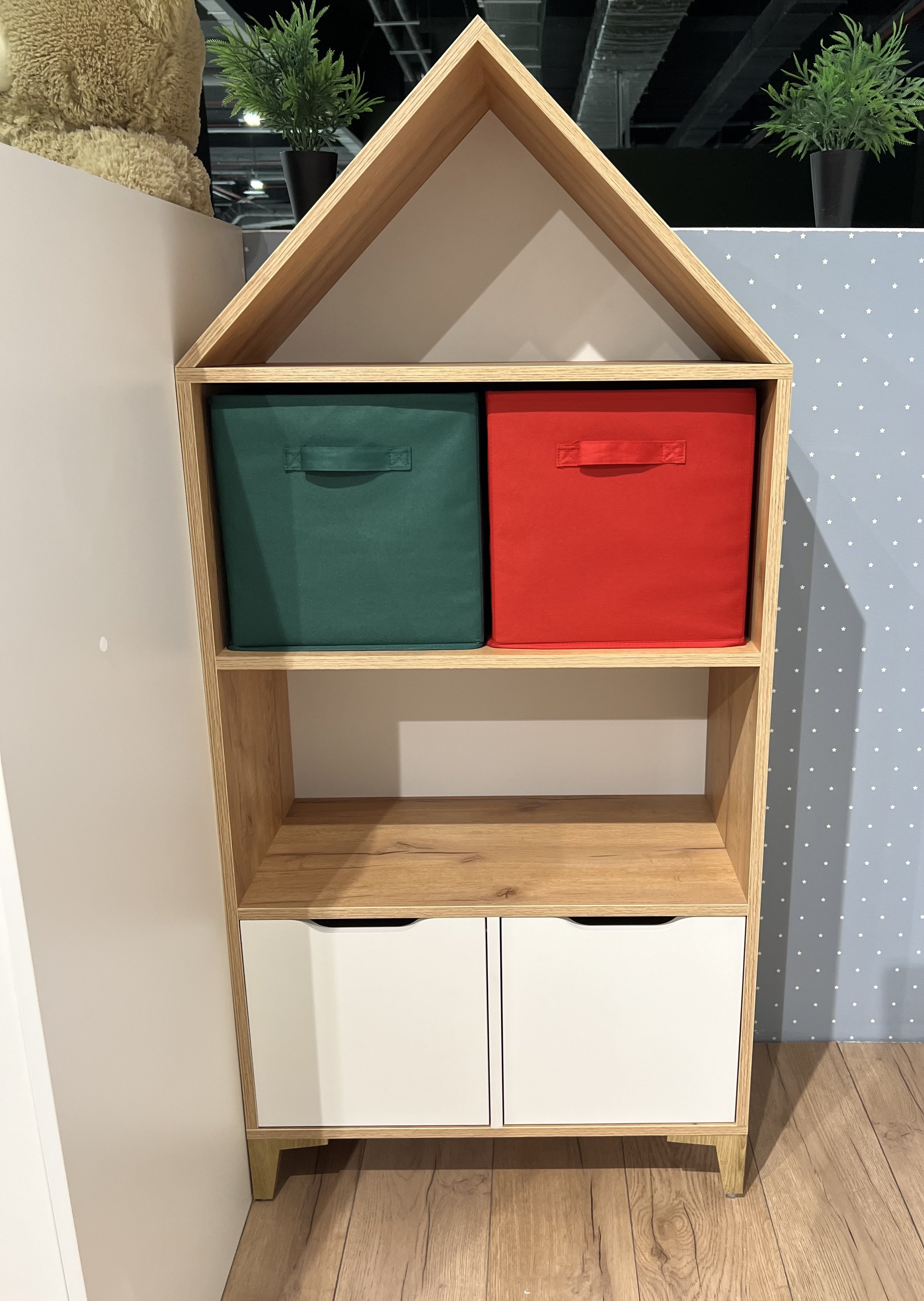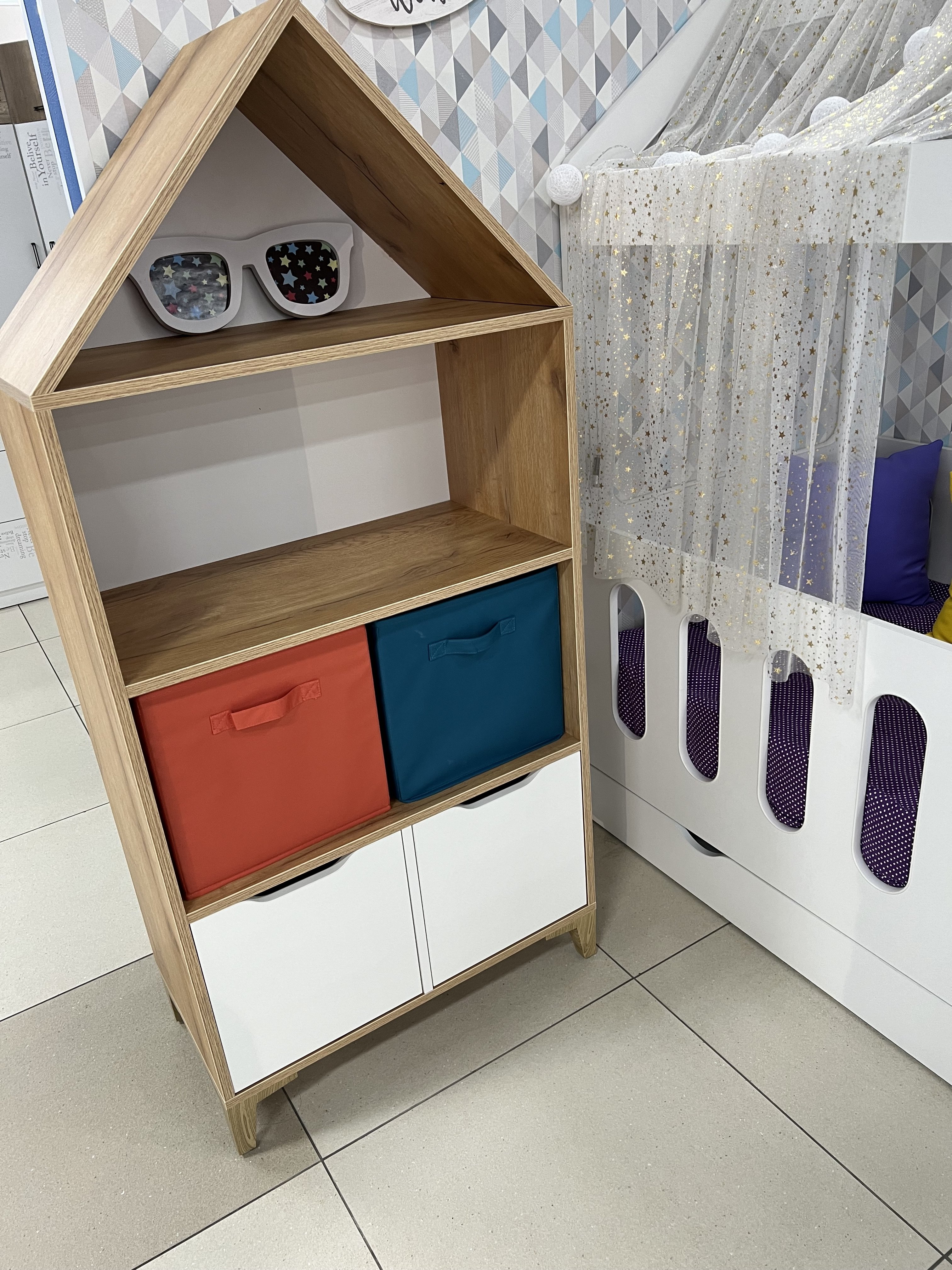 Стеллаж в виде домика - оригинальное и практичное дополнение в интерьере детской комнаты.