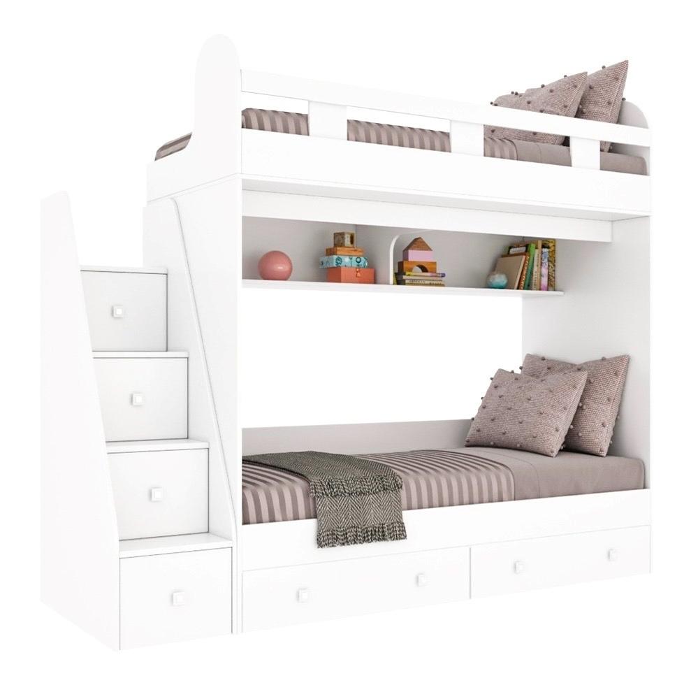 Прочная двухъярусная кровать Юниор-2 с удобной лестницей, безопасным высоким бортиком и ящиками для хранения.